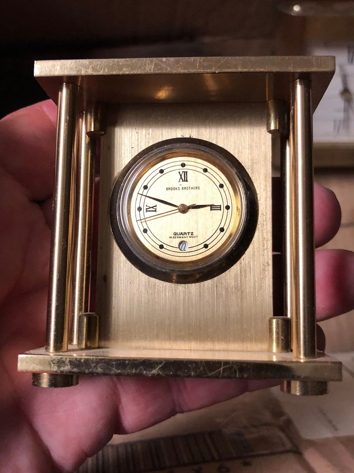 Miniature grandfather,Tiffany and Co. travel clock, Automobile clock, Brooks Brother's travel clock