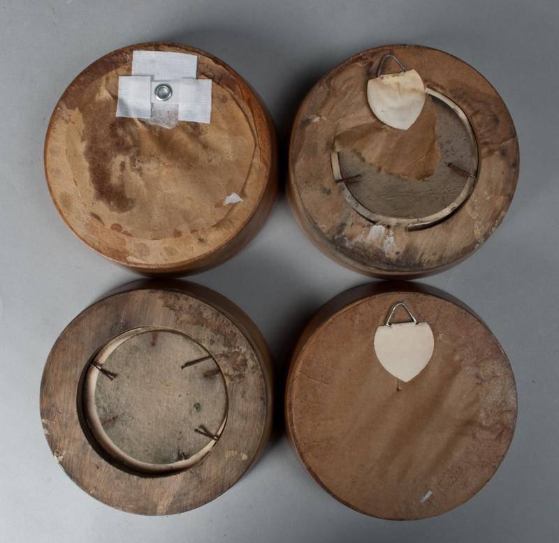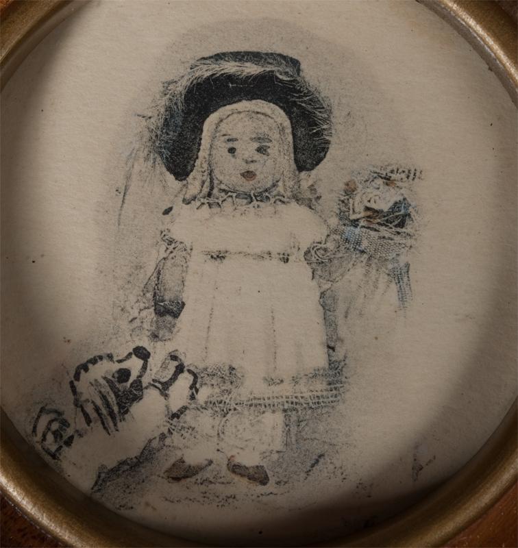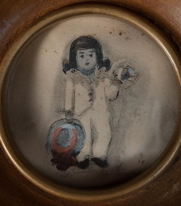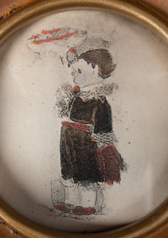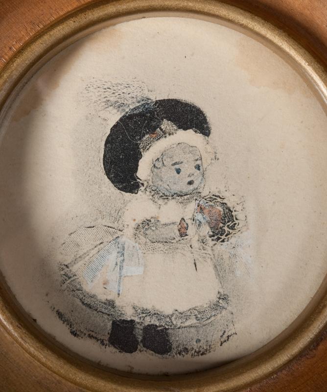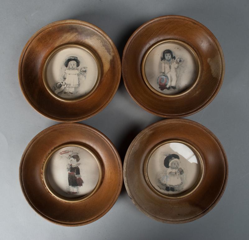 Eached in round wood frame depicting small children and each with watercolor highlights. Partial printed name or title on bottom, illegible. 5" Dia. (entire).