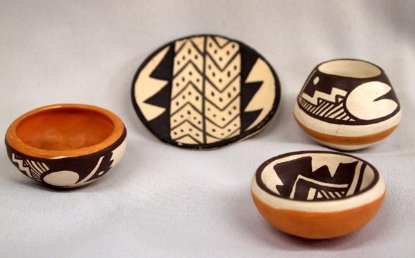 4 Miniature Isleta and Acoma Pottery Bowls. The three bowls are all by Isleta Pueblo artist, S. Teller and are signed on the bottom. The plate bowl is by Acoma artist Wanda and is also signed on the bottom. It is 2.5'' diameter and 3/8'' high.