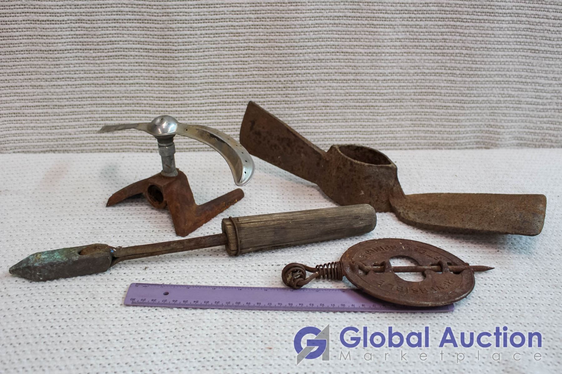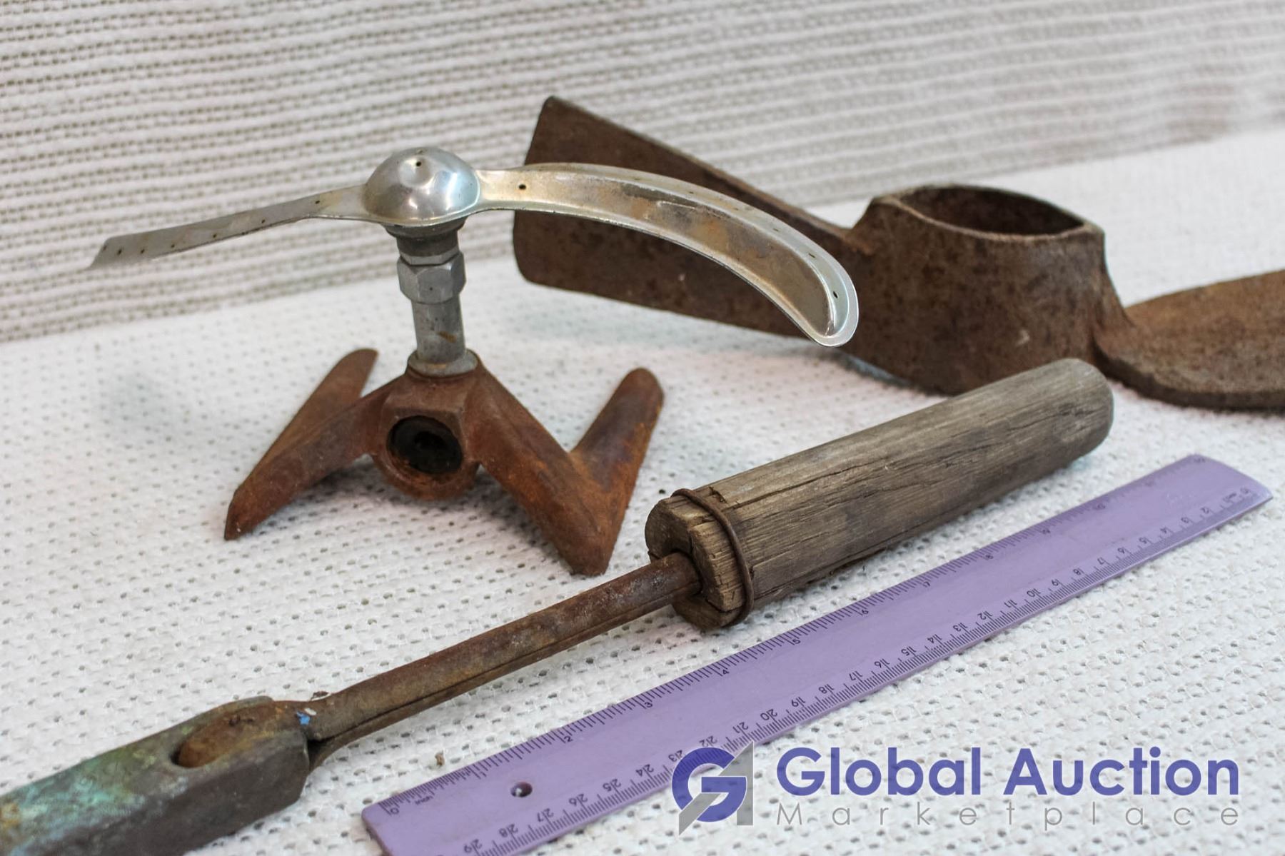(4) Misc Cast Iron Tools (Pick Head, Sprinkler, etc)