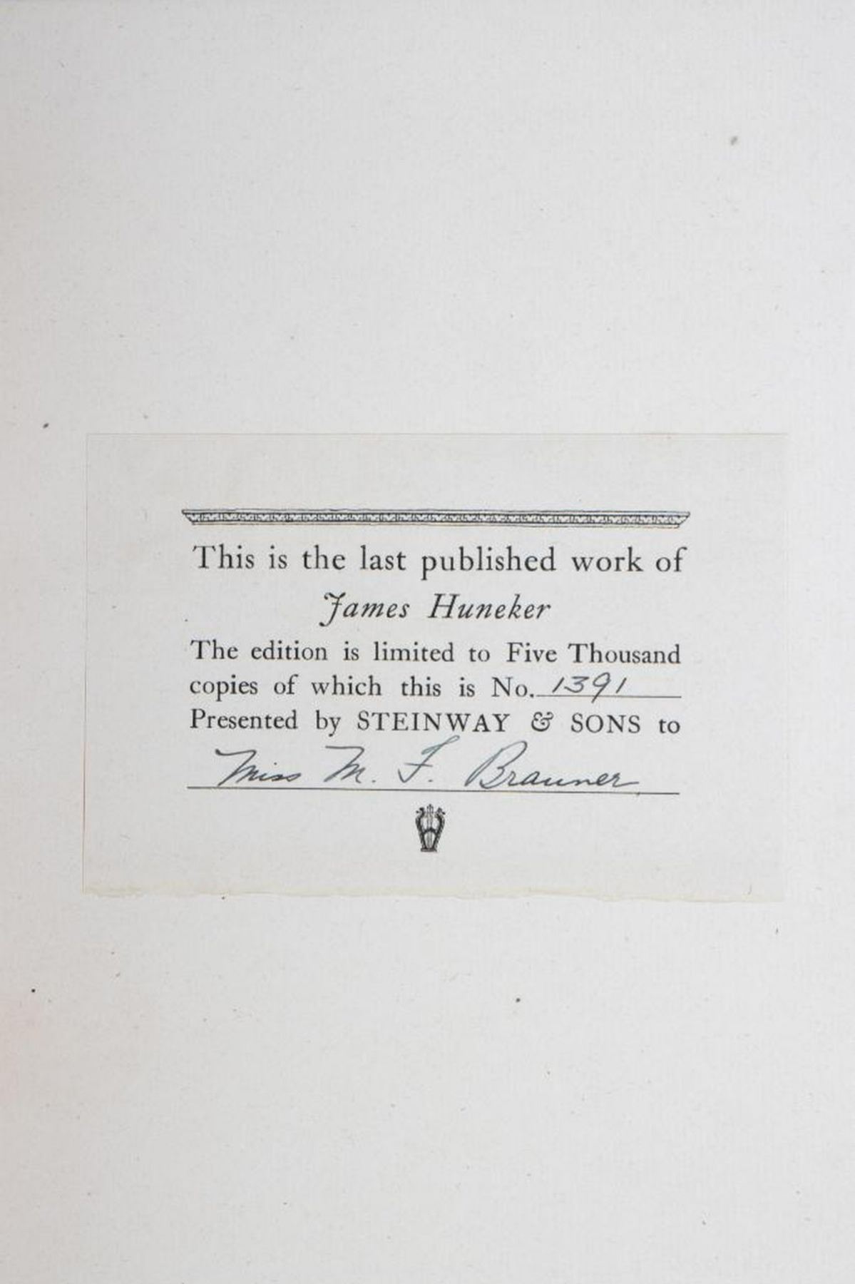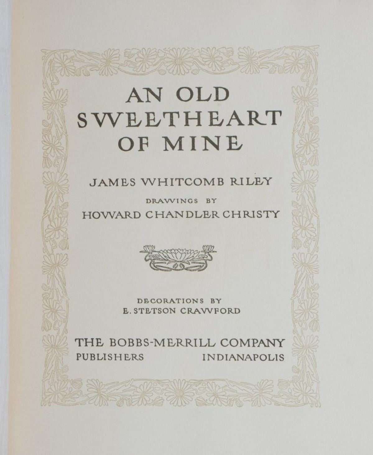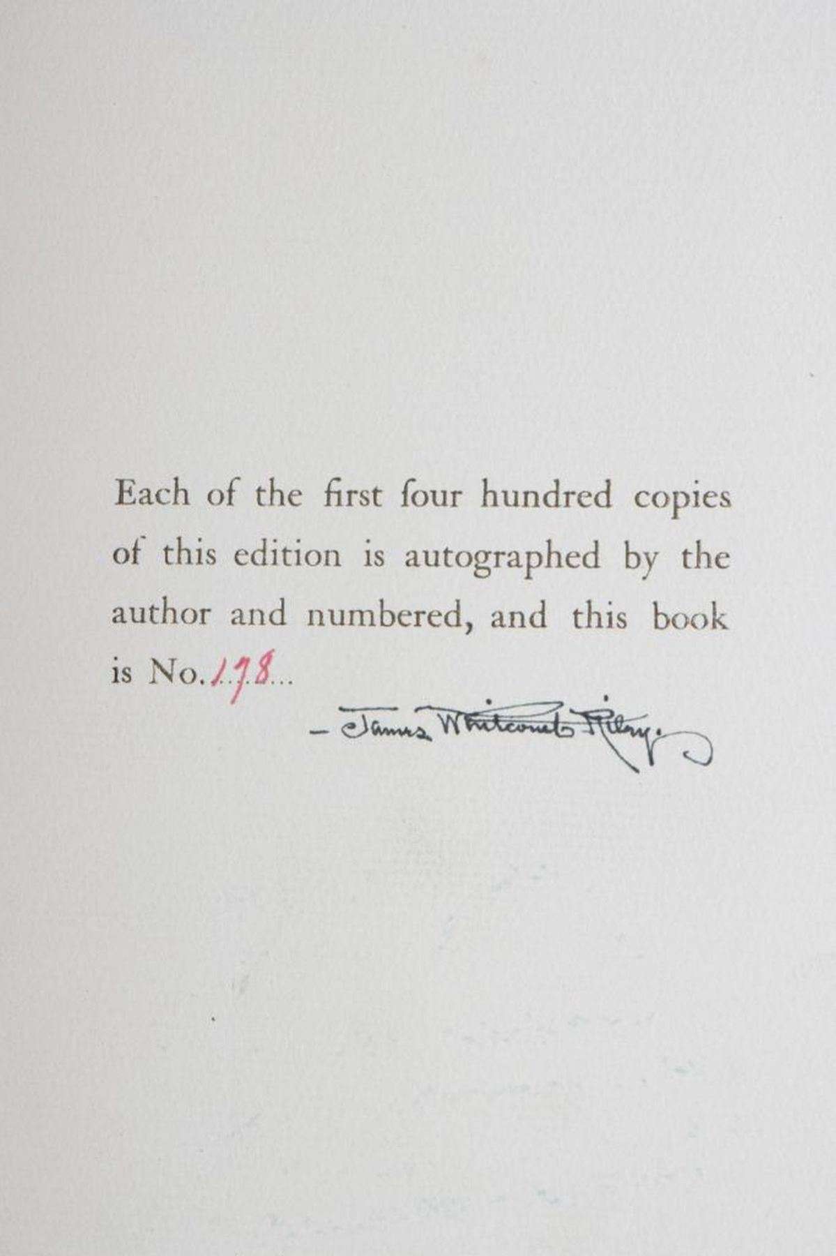 1.-2. TOBIN, AGNES. San Francisco: Grabhorn Press for John Howell, 1958. Two Limited Editions of 400 each: Letters, Translations, Poems, with Some Account of Her Life; and Phaedra. The paper wraps and fore-edges are foxed, but otherwise they are Very Good. 3. HUNKER, JAMES. The Steinway Collection of Paintings by American Artists Together with Prose Portraits of the Great Composers. Steinway & Sons: 1919. No. 1391 of Limited Edition of 5000. Tipped-in color illustrations. Fading and staining to the covers. 5. RILEY, JAMES WHITCOMB. An Old Sweetheart of Mine. Indianapolis: the Bobbs-Merrill Company, 1903. No. 198 of Limited Edition, Signed. Drawings by Howard Chandler Christy; decorations by E. Stetson Cravvford. Fair; cover very worn.