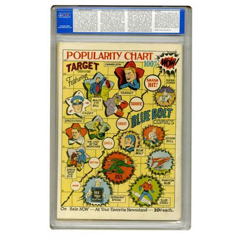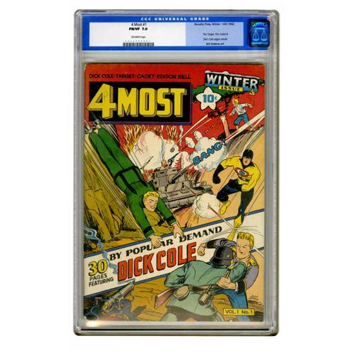 <B>4 Most #1 (Novelty Press, 1941) CGC FN/VF 7.0 Off-white pages.</B></I> This new series brought together the biggest stars of Novelty's other titles. Granted, Novelty only had two other titles, <B>Target</B></I> and <B>Blue Bolt</B></I>, but the quality of all three series was assured thanks to being produced by the Funnies Inc. "shop" of artists. The cover is by John Jordan. Only one copy of this issue has been certified with a higher grade by CGC to date. Overstreet 2005 FN 6.0 value = $438; VF 8.0 value = $913. CGC census 12/05: 2 in 7.0, 1 higher.
