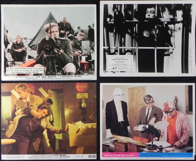 This is a great lot of a variety of movie lobby cards. In this lot you will receive: "The Red Barron" starring John Phillip Law and Don Stroud, "I Saw What You Did" starring Joan Crawford, "Mr. Majestyk" starring Charles Bronson, and "Now You See Him, Now You Don't" starring Kurt Russell and Cesar Romero. They measure out to be 8" x 10" and range from good to very good condition. These classic movie lobby cards will fit well into any collection!