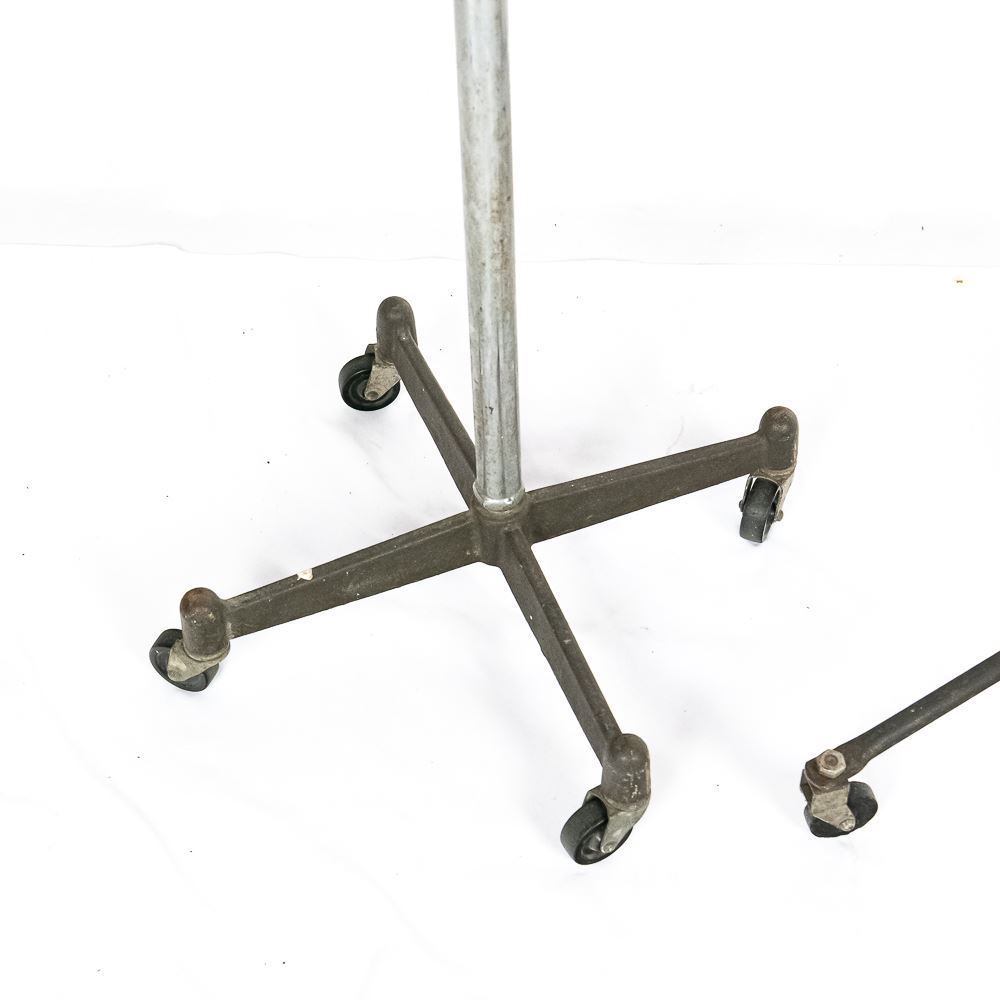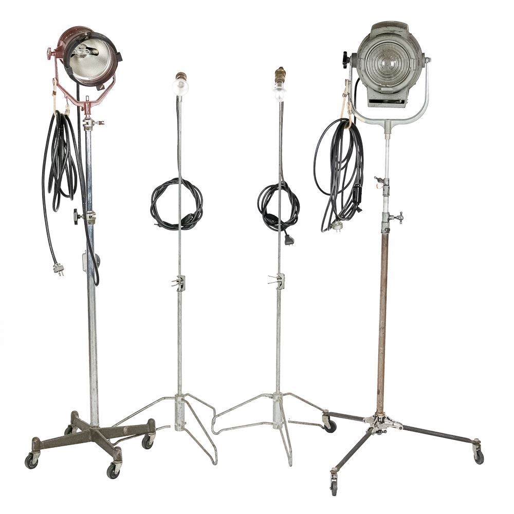 Vintage movie studio photography lights on adjustable metal tripod stands includes a Bardwell and MacAllister, a Mole Richardson, and 2 bare bulb filllights. All in good condition.
