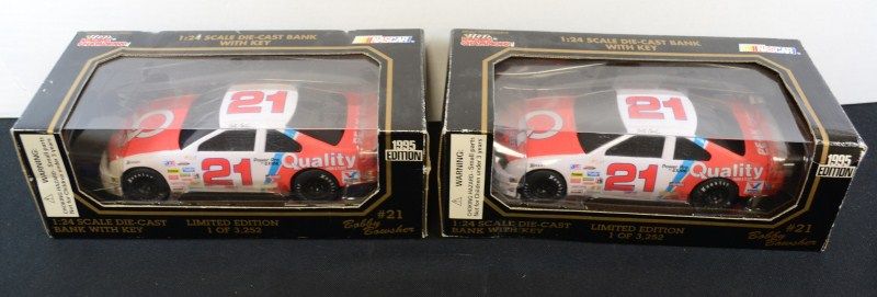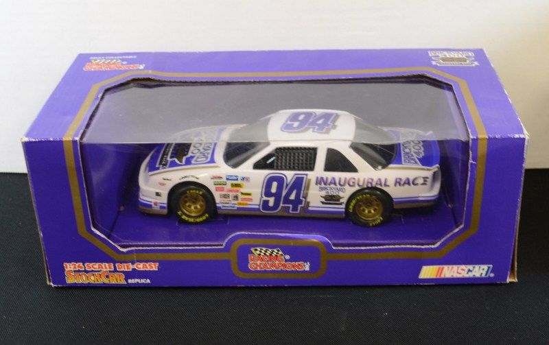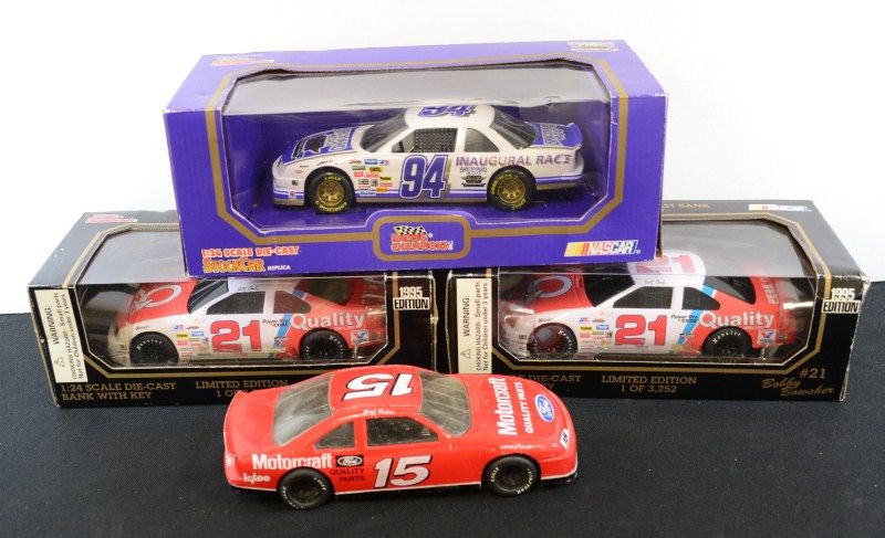 2 - 1995 EDITION RACING CHAMPIONS/NASCAR 1:24 DIE-CAST BANK #21 BOBBY BOWSHER NEW IN BOX. Racing Champions 1/24 Stock Car Replica Brickyard 400 Inaugural Race #94 NEW IN BOX. RACING CHAMPIONS BANK GEOFF BODINE #15 FORD MOTORCRAFT 1/24 shows wear no box. E