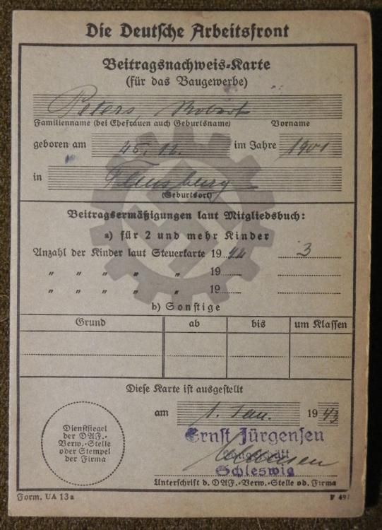 HERE IS A RARE ORIGINAL GROUPING OF 4 NAZI ITEMS OF ROBERT PETERS OF THE DAF/1944 SKETCH, TWO ID'S & PHOTO.THIS IS AN ORIGINAL GROUPING OF NAZI DAF/TODT OFFICER ROBERT PETERS. THERE IS A LARGE FRAMED 11X14 CHARCOAL SKETCH OF HIM THAT IS SIGNED & DATED 1944. HIS DAF/DEUTSCHES ARBEIT FRONT-ORGANIZATION TODT ID BOOK WITH DUES STAMPS. THERE IS A POSTWAR CHRISTMAS PHOTO & KENNKARTE/ID FROM 1946. ALL OF THE ITEMS ARE FROM SAME MAN, ALL ORIGINALS.