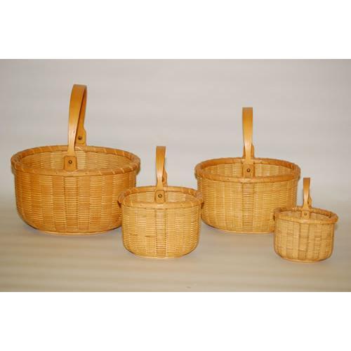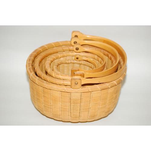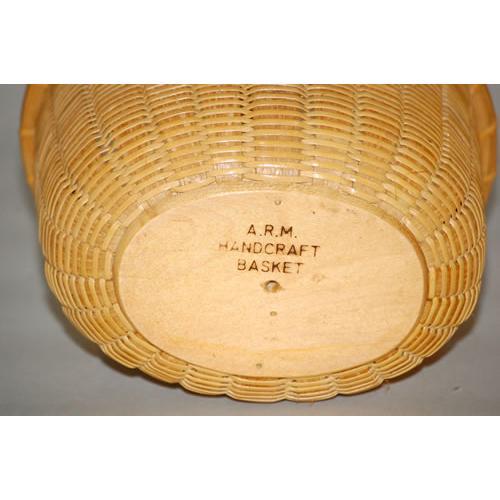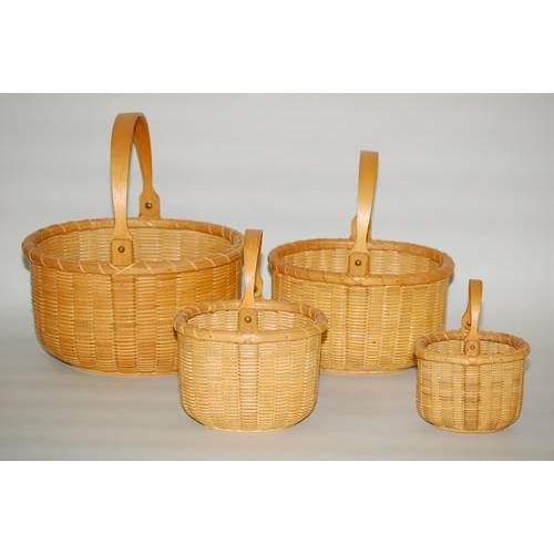 (4) NESTED A.R.M. NANTUCKET BASKETS - NESTED SET (4) ARTHUR R. MARTIN NANTUCKET BASKETS W/ HARDWOOD BASES, RIMS & SHAPED BAIL HANDLES-ALL SIGNED A.R.M. HANDCRAFT BASKET (W/ BUSINESS CARD) (5", 6 1/2", 7" & 8" TALL BASKETS WITHOUT HANDLES)