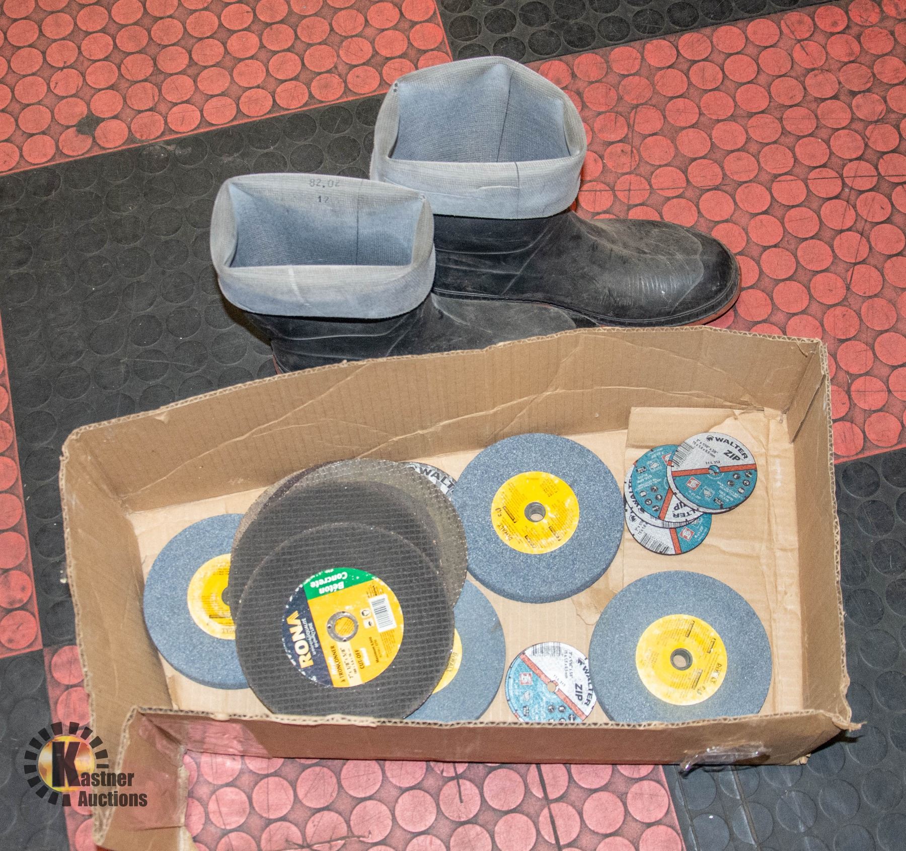 ZIP DISCS FOR CUTTING METAL AND RUBBER BOOTS SIZE 12 **ALL ITEMS MUST BE REMOVED BY 5PM SATURDAY, SEPTEMBER 2ND 2023. ALL REMAINING ITEMS WILL BE SUBJECT TO A $6.00 PER DAY STORAGE CHARGE. ANY ITEMS REMAINING AFTER MONDAY, SEPTEMBER 18TH, 2023 WILL BE CONSIDERED FORFEITED. NO REFUNDS WILL BE ISSUED FOR FORFEITED ITEMS. TO SCHEDULE A PICK UP APPOINTMENT CLICK HERE