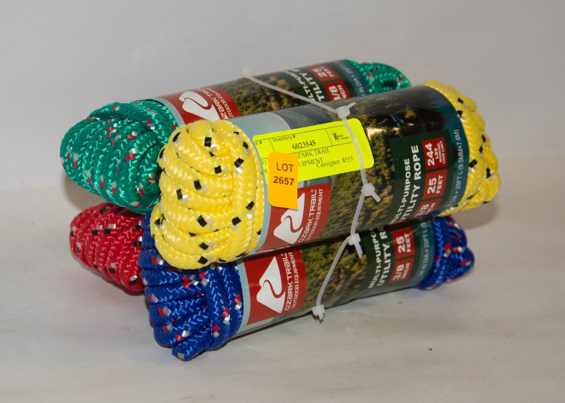 MULTI-PURPOSE UTILUTY ROPES 25FT X 3/8 INCH EACH ROLL 244LB WORKING LOAD LIMIT **ALL ITEMS MUST BE REMOVED BY 5PM SATURDAY, FEBRUARY 8TH 2025. ALL REMAINING ITEMS WILL BE SUBJECT TO A $6.00 PER DAY STORAGE CHARGE. ANY ITEMS REMAINING AFTER MONDAY, MARCH 3RD 2025 WILL BE CONSIDERED FORFEITED. NO REFUNDS WILL BE ISSUED FOR FORFEITED ITEMS. TO SCHEDULE A PICK UP APPOINTMENT CLICK HERE