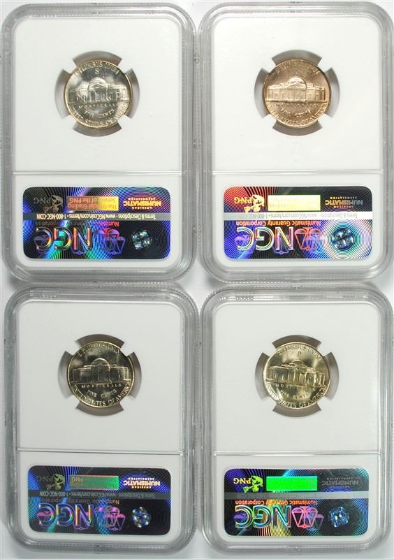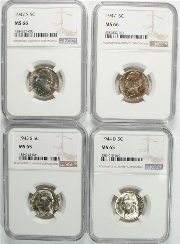 4-NGC GRADED JEFFERSON NICKELS: 1942-S & 1947 MS-66, 1943-S & 1944-D MS-65