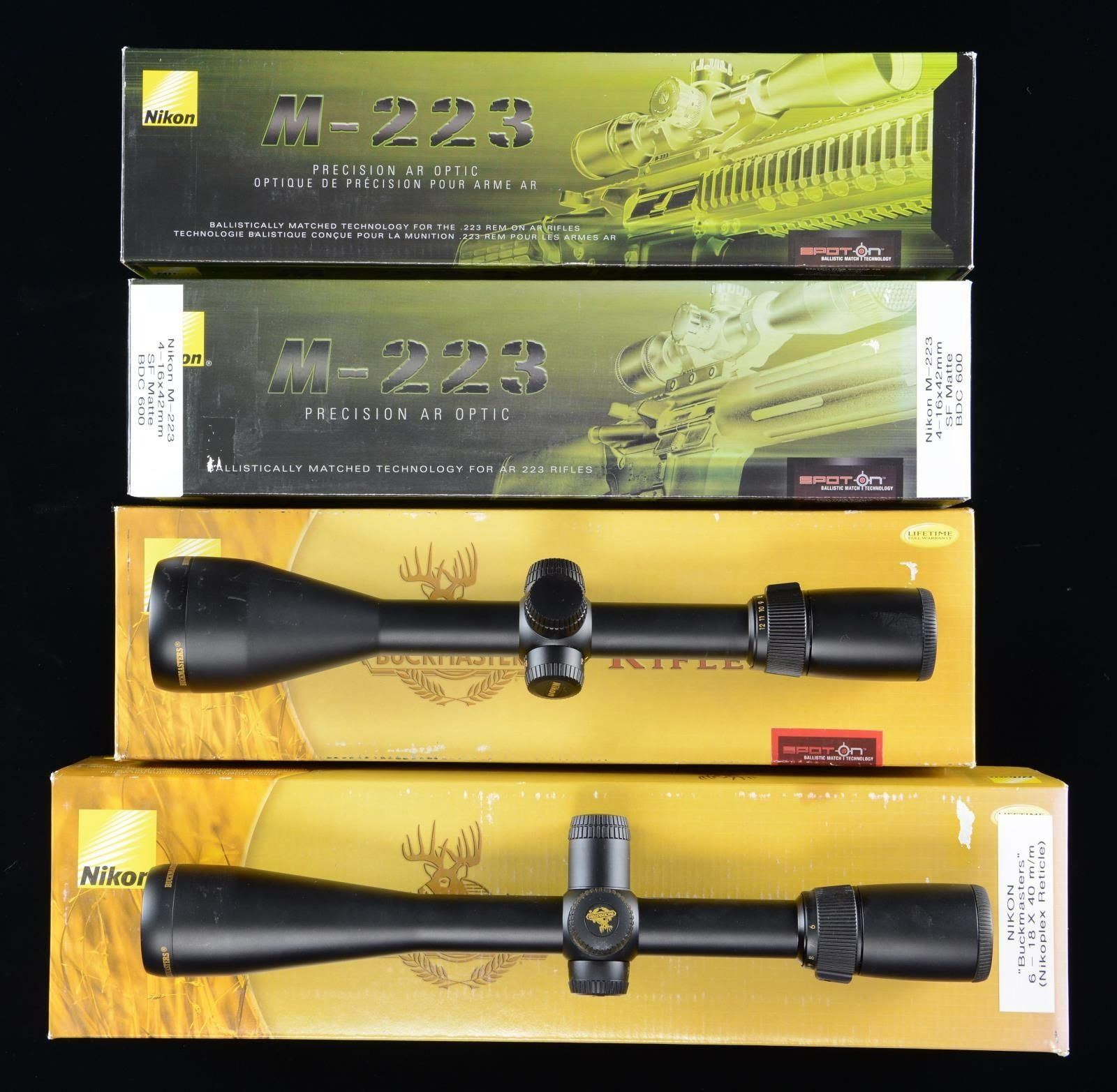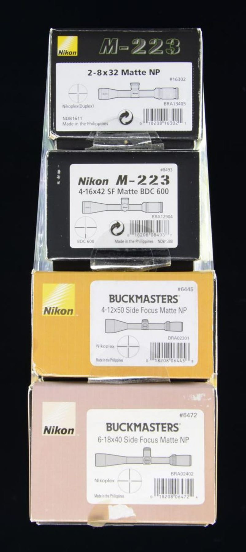 1) M-223 #16302 2-8x32 MATTE NP 1" SCOPE. UPC: 018208163021. Nikoplex reticle. Comes with box & packaging. 2) M-223 4-16x42 SF MATTE 1" SCOPE. UPC: 018208084937. BDC 600 reticle. Comes with box & packaging. 3) BUCKMASTERS 4-12x50 Side Focus Matte Black SCOPE. UPC: 018208064458. Nikoplex reticle. Cemes with box & packaging. 4) BUCKMASTERS 6-18x40 SIDE FOCUS MATTE BLACK NP SCOPE. UPC: 018208064724. Nikoplex reticle. Comes with box & packaging. CONDITION: scopes appear near excellent. Boxes look very good to near excellent, with retailer stickers. PROVENANCE: the Collection of Gun Sport Ltd owned by Jon R. Thomas. (02-20708/MD). $750-1000.