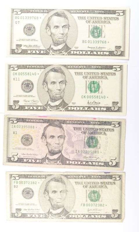 4 NOTES: 2- $5.00 ERROR NOTES 2006 OVERPRINT, 2003 STAR NOTE & 2 - $5.00 GEM UNC