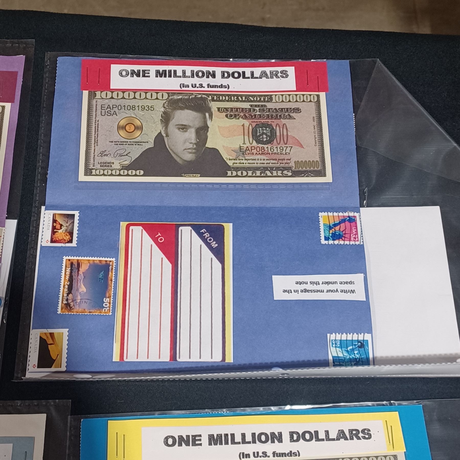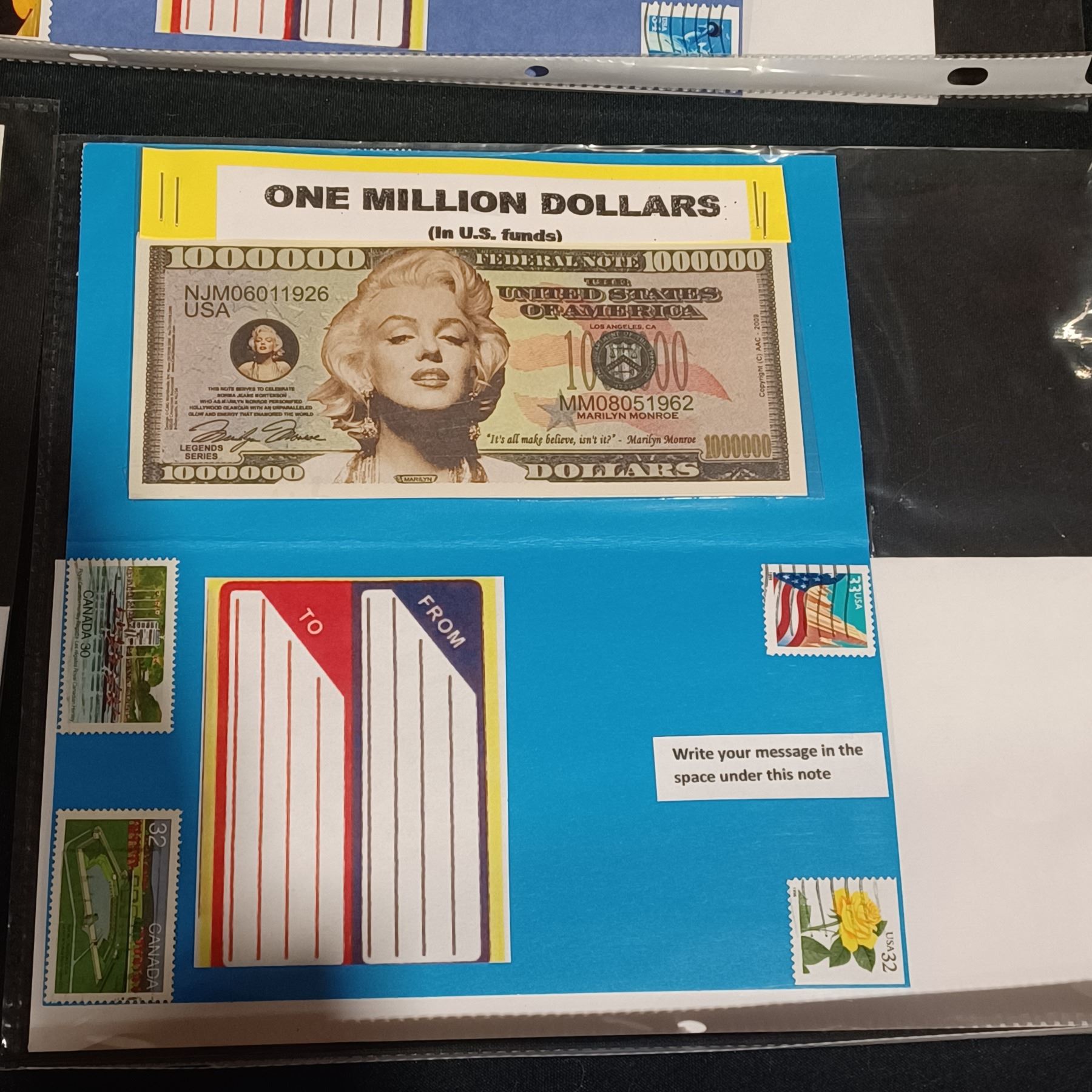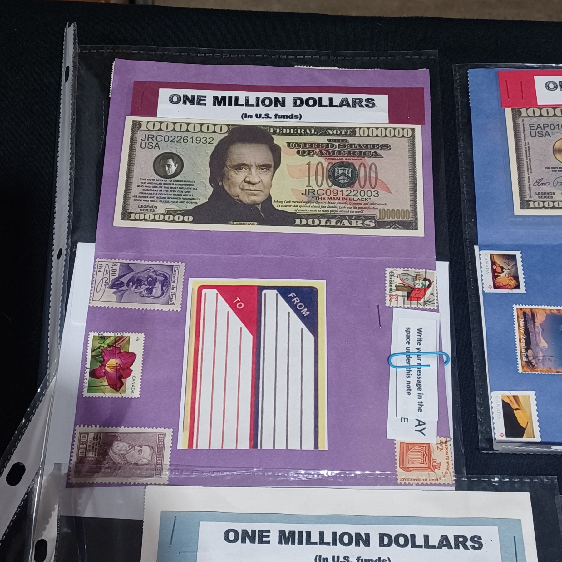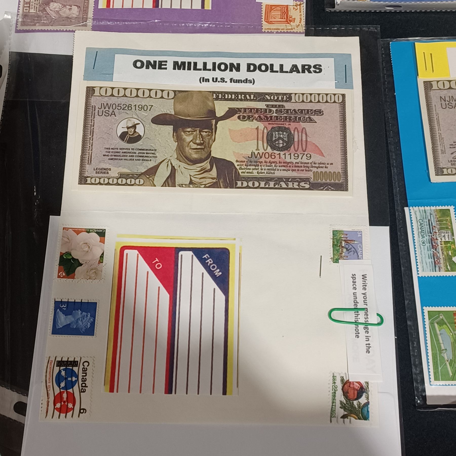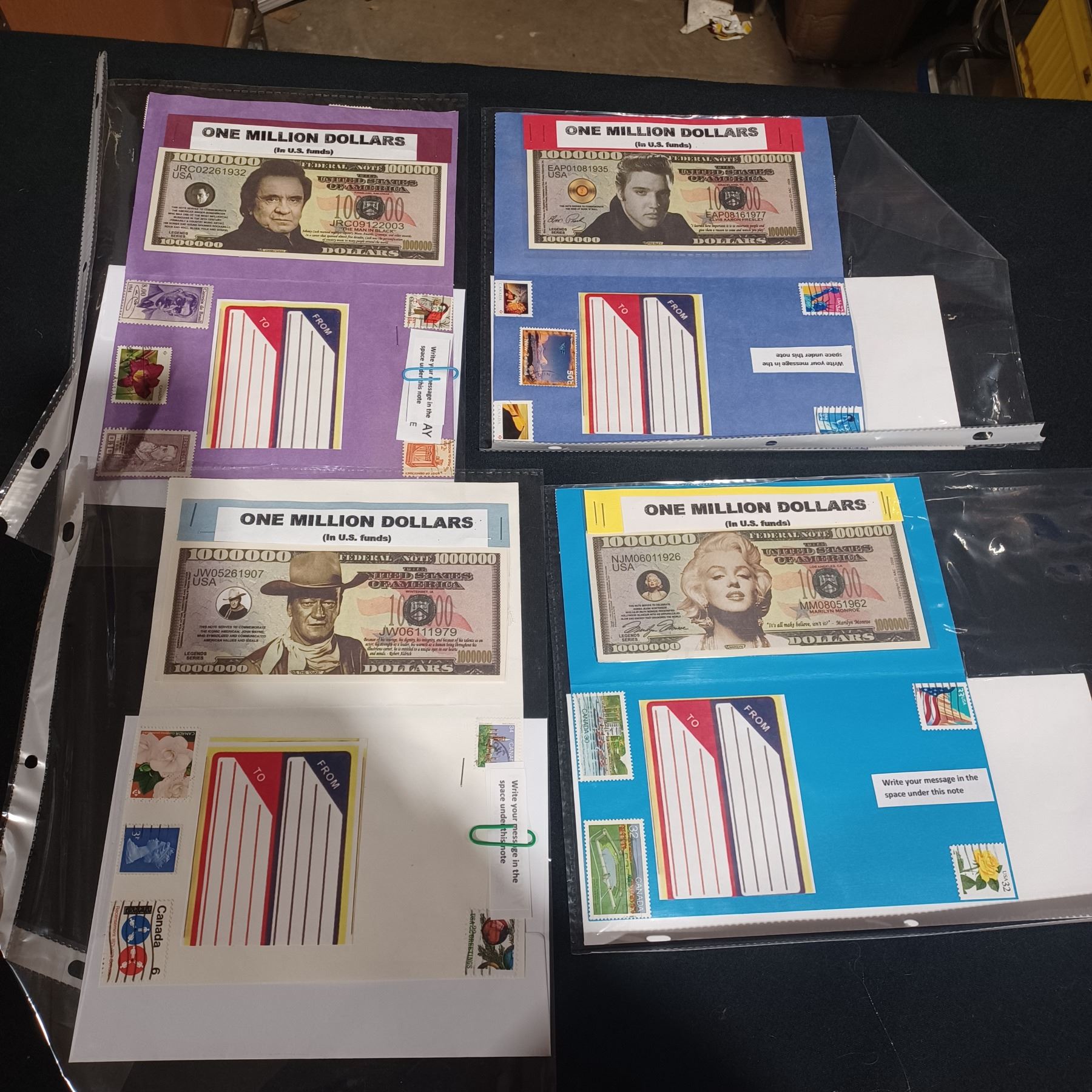 4 NOVELTY BILLS AND ASSORTED STAMPS