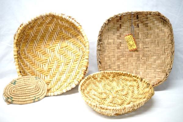 4 Native American Baskets, largest sifter basket measures 4'' x 11'', includes 2 sifter baskets, and 2 basketry trays