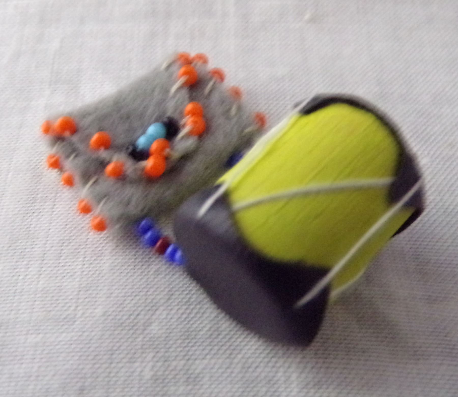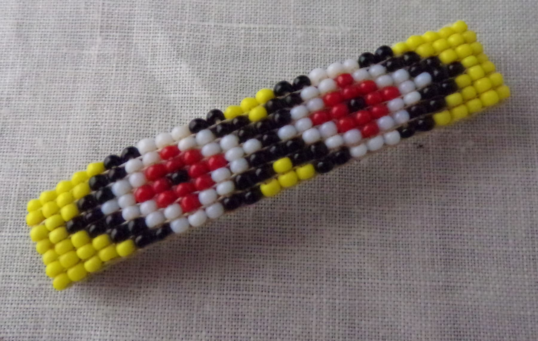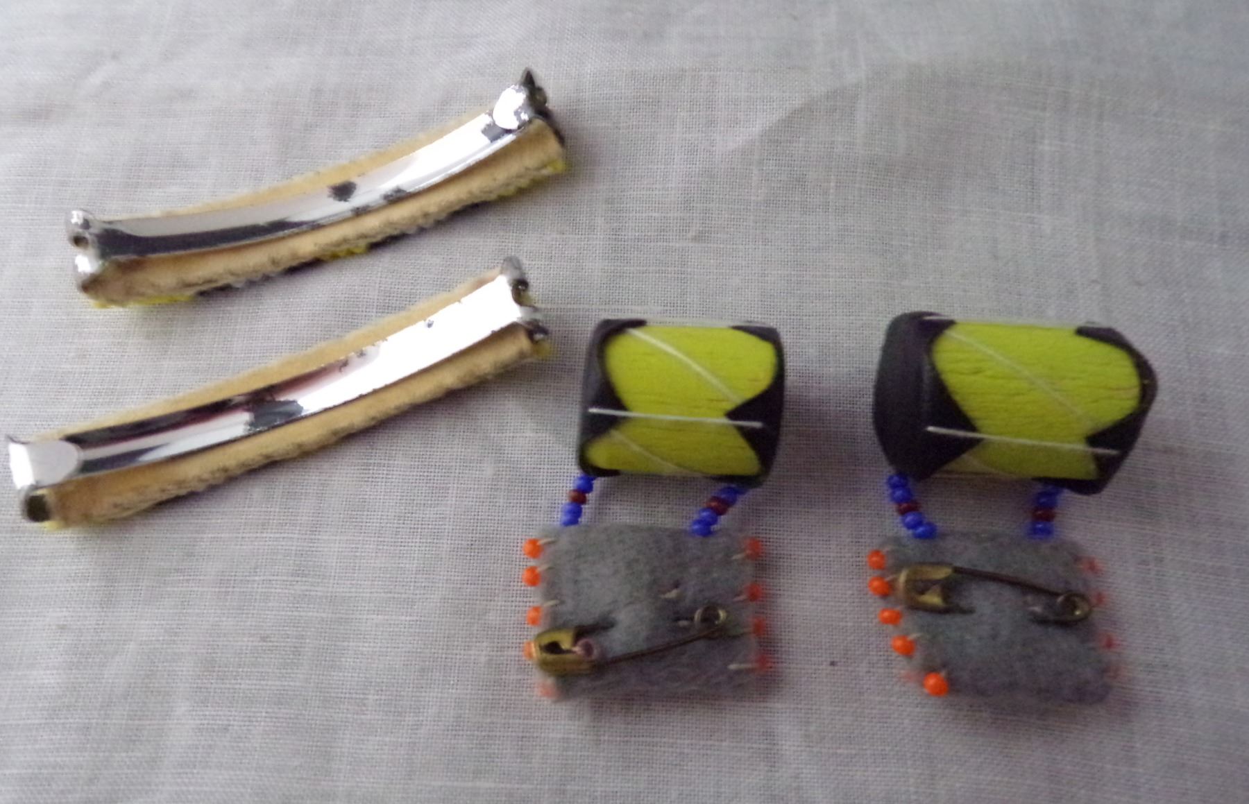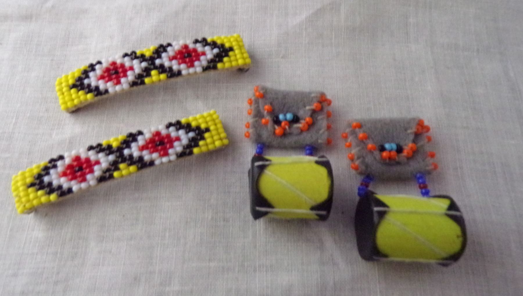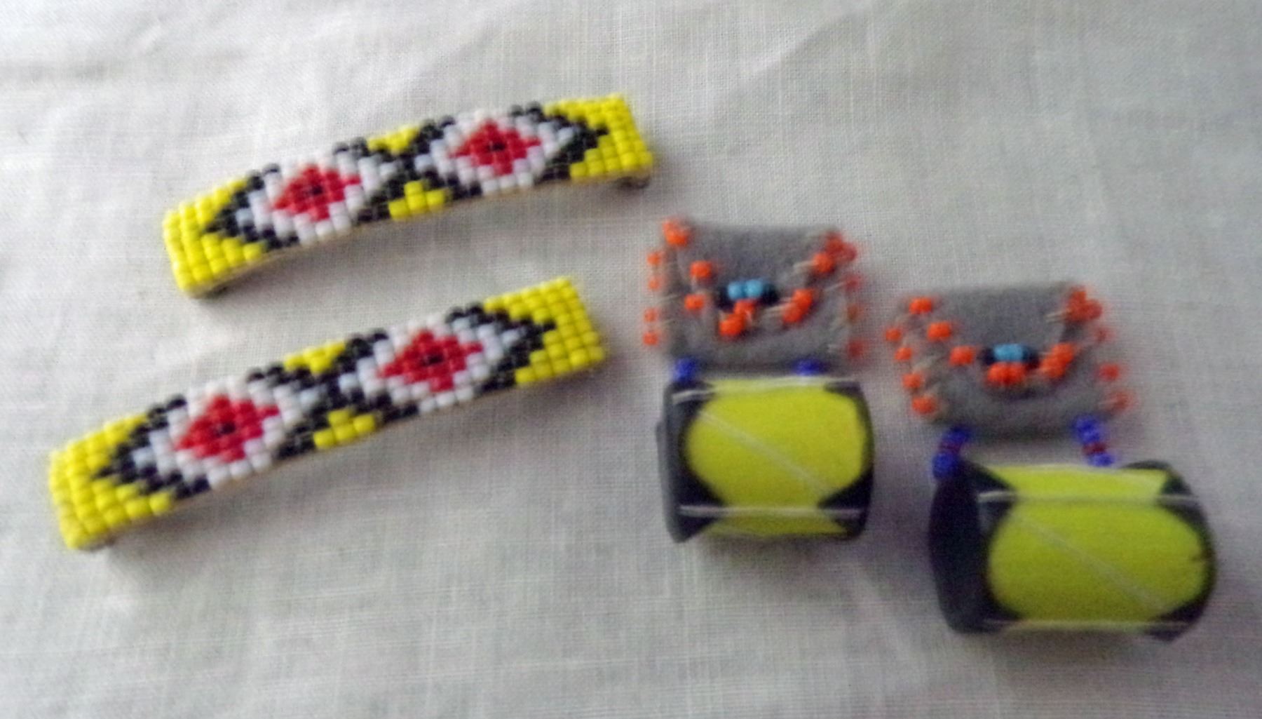 4 Native American Beaded Pins and Barrettes, includes 2 purse drum combination pins and 2 barrettes, pins measure 1.5''L x 1'', matching barrettes measure 2.25''L x .5''W, beautiful vibrant colors