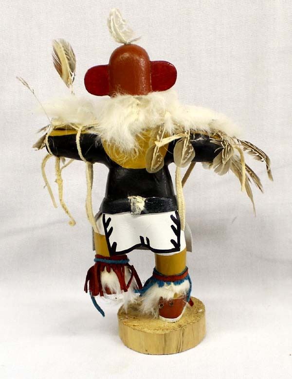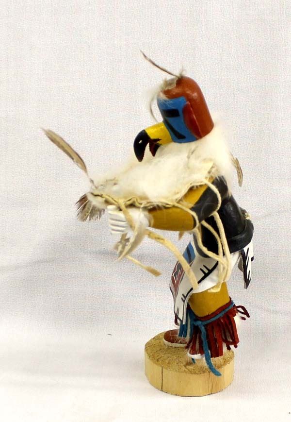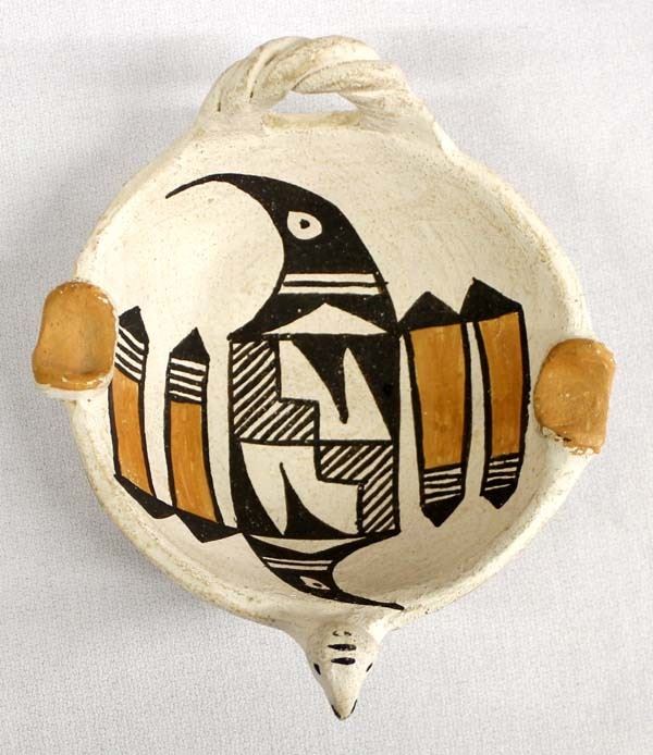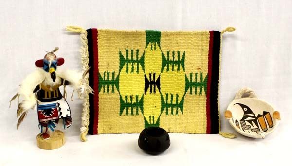 4 Native American Collectibles, includes 1. Vintage Navajo Sampler Rug, measures 12'' x 9'', fringed on one end and 2 tassels on the other 2. Navajo Eagle Kachina measuring 8.75'' x 6'' (includes feathers) 3. Santa Clara Pottery Jar by Merton & Linda Sisneros, measuring 2.5''D x 1.75''H, signed on the bottom 4. Vintage Acoma Pottery Bird Ashtray, measures 5.5'' x 5''