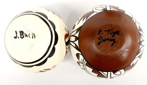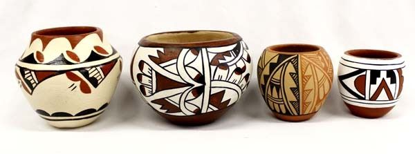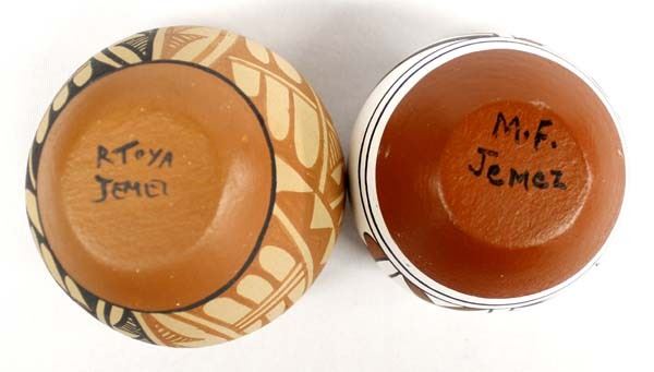 4 Native American Jemez Pottery Bowls, includes: 1. by R. Toya 2. by M. F. Romero 3. by J. Baca 4. largest is by C. Toya and measures 4'' x 5''