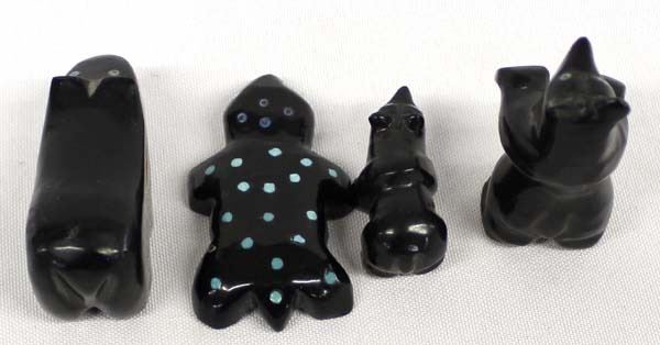 4 Native American Navajo Jet Fetishes, largest measures 1'' x 2'' and includes 3 bears and 1 frog, all have turquoise eyes and frog has turquoise spots