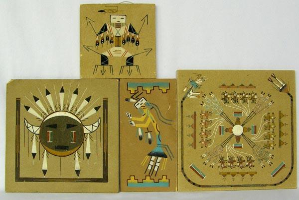 4 Native American Sandpaintings. The largest measures approx. 13''x13''. There is age related damage, as pictured. Buyers Pay Actual Shipping and Handling Charges(see terms and conditions for more information)