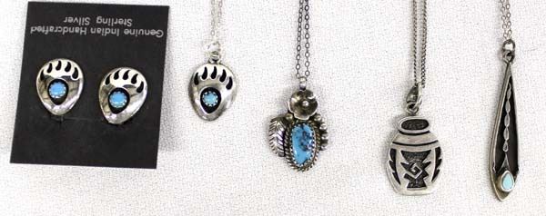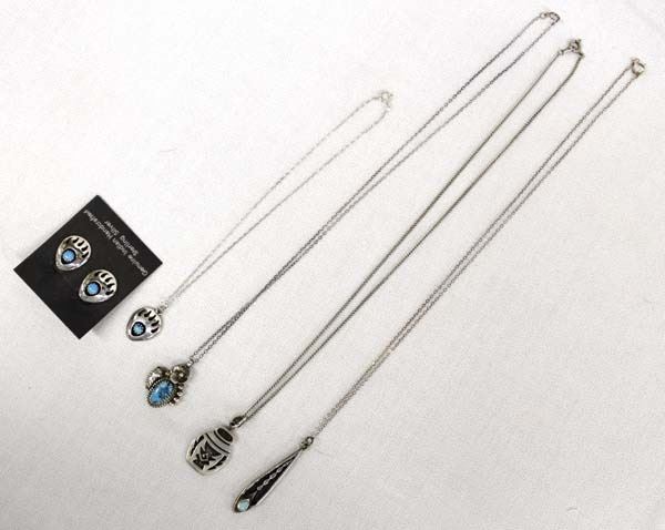 4 Native American Necklaces and 1 Pair of Earrings, includes: 1. Sterling Bear Paw Necklace and Matching Clip-On Earrings, pendant stamped sterling 2. Sterling Pottery Jar Pendant Necklace, pendant stamped .925 and hallmarked 3. Sterling Teardrop Turquoise Pendant Necklace 4. Sterling Turquoise Pendant Necklace, all chains measure 18''L end to end and longest pendant measures 1.75L x 3/8''W