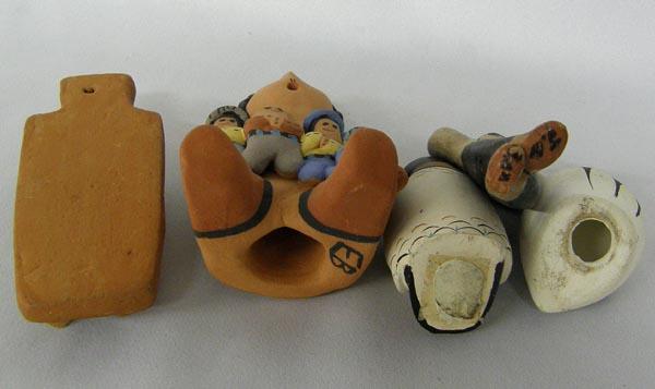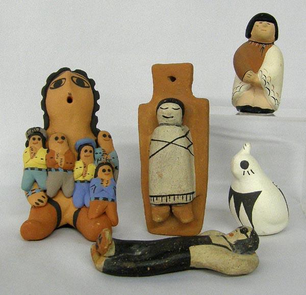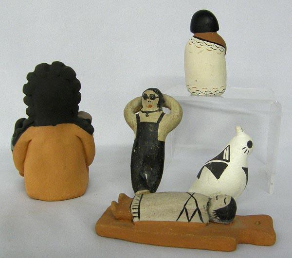 4 Native American Pottery Figures. Storyteller is largest at 4.5''x2.5'' and is signed EB for Betoni. Also included is Acoma bird figure, Santo Domingo reclining man and others. SHI $25.