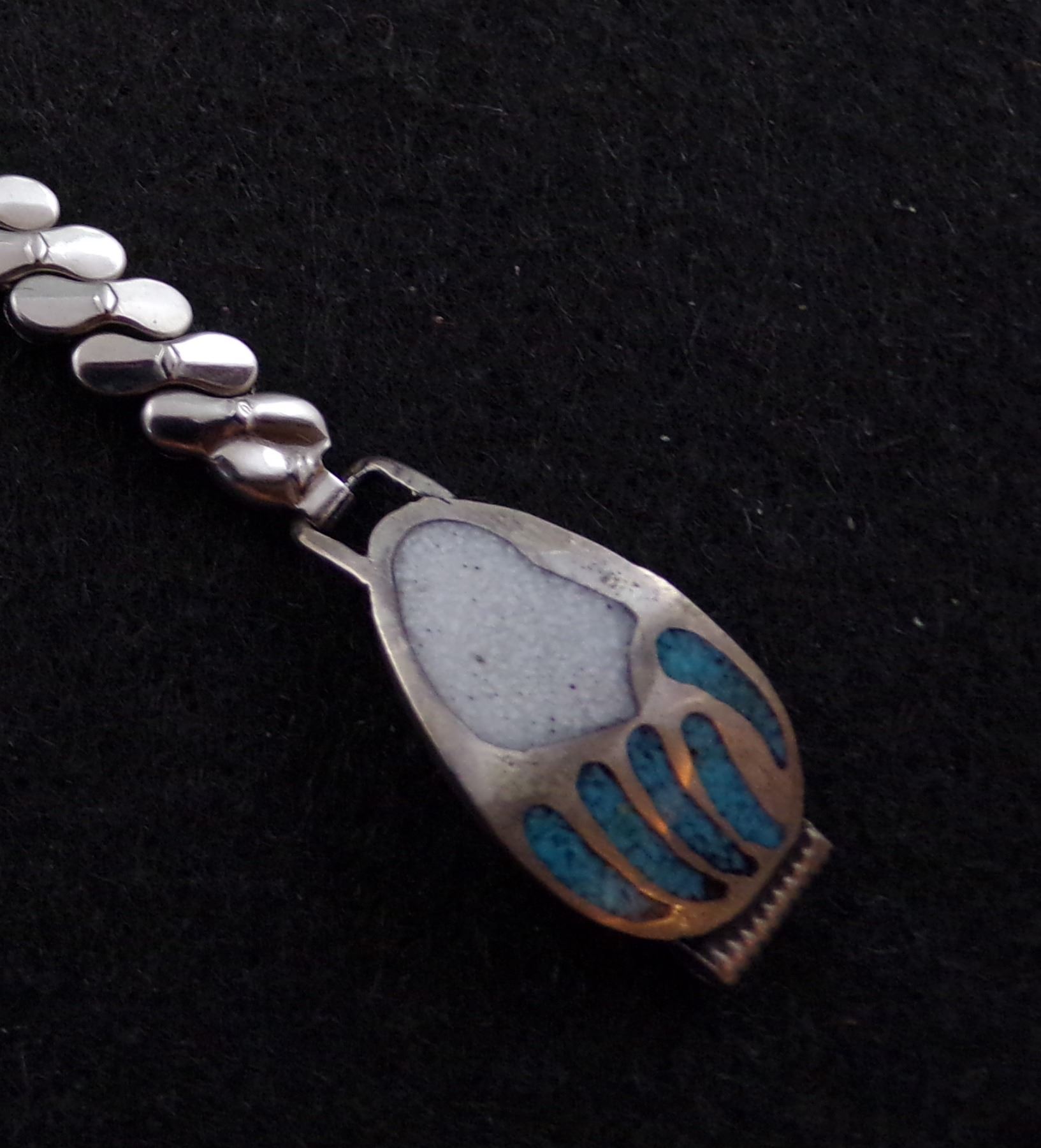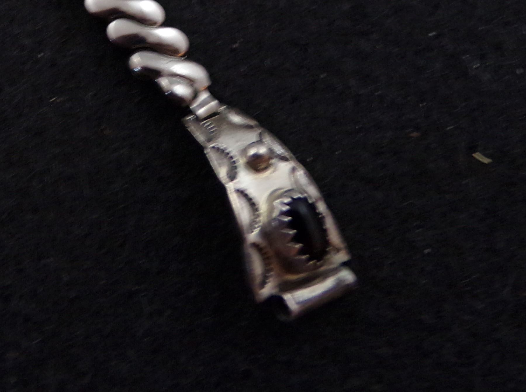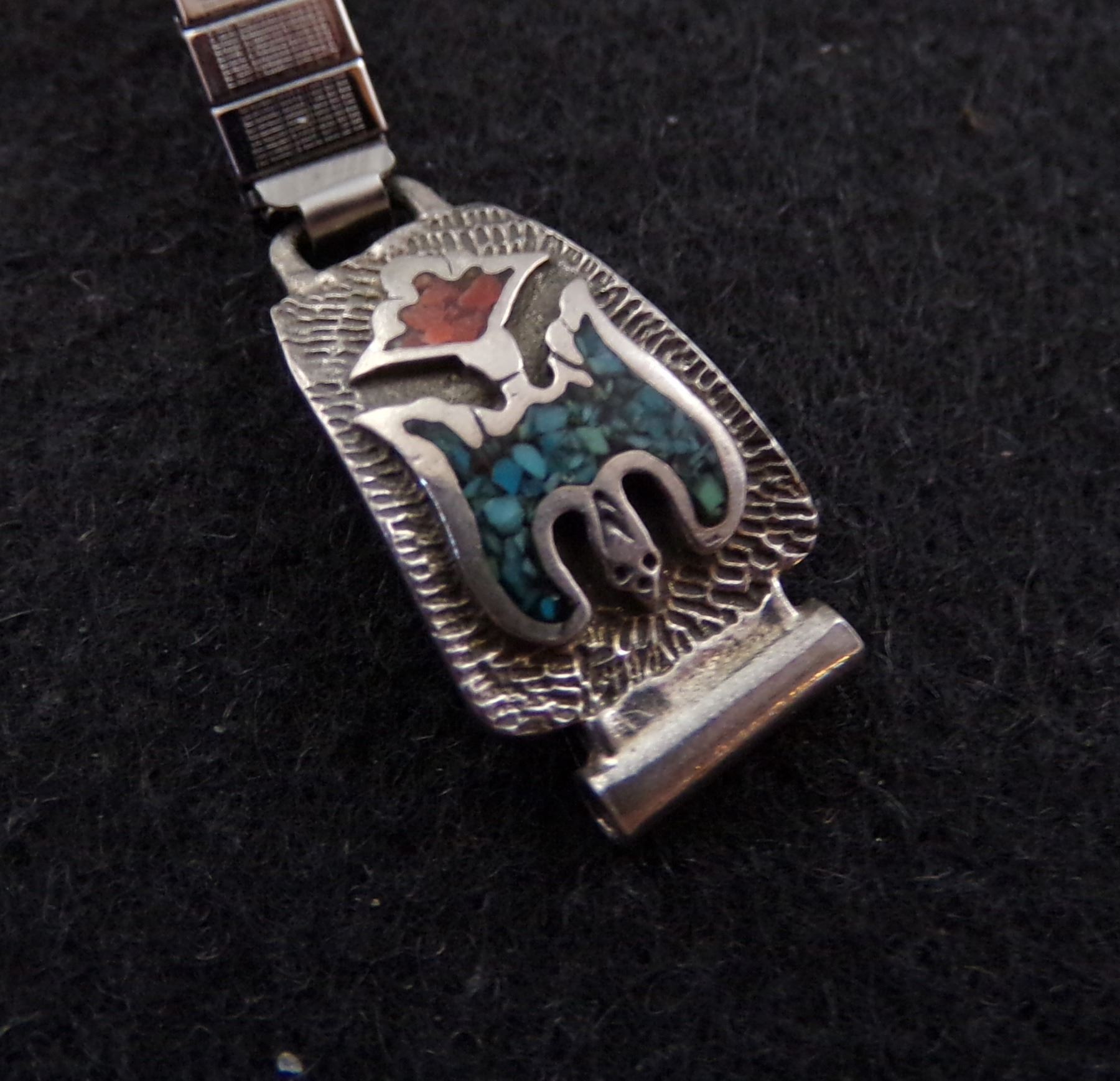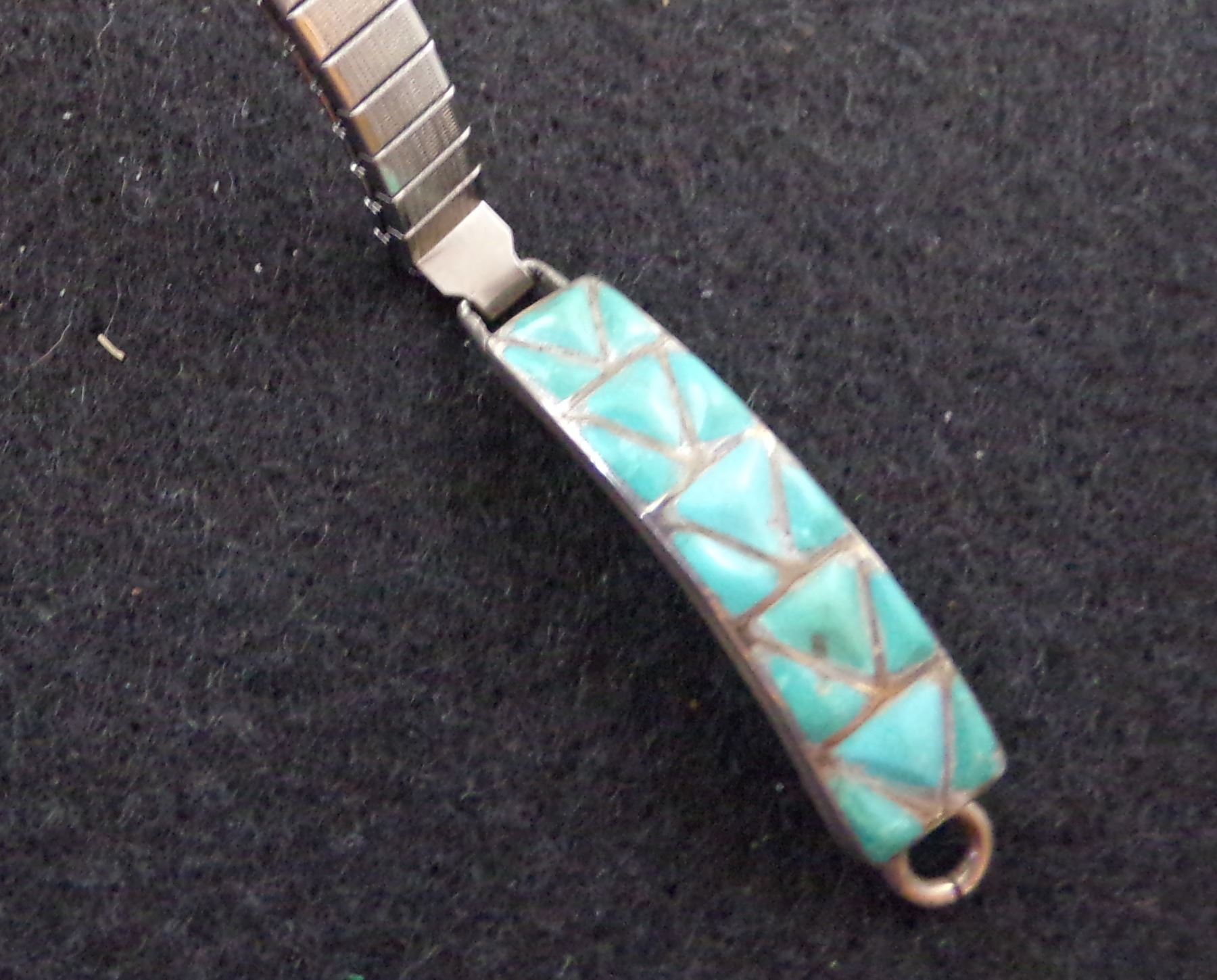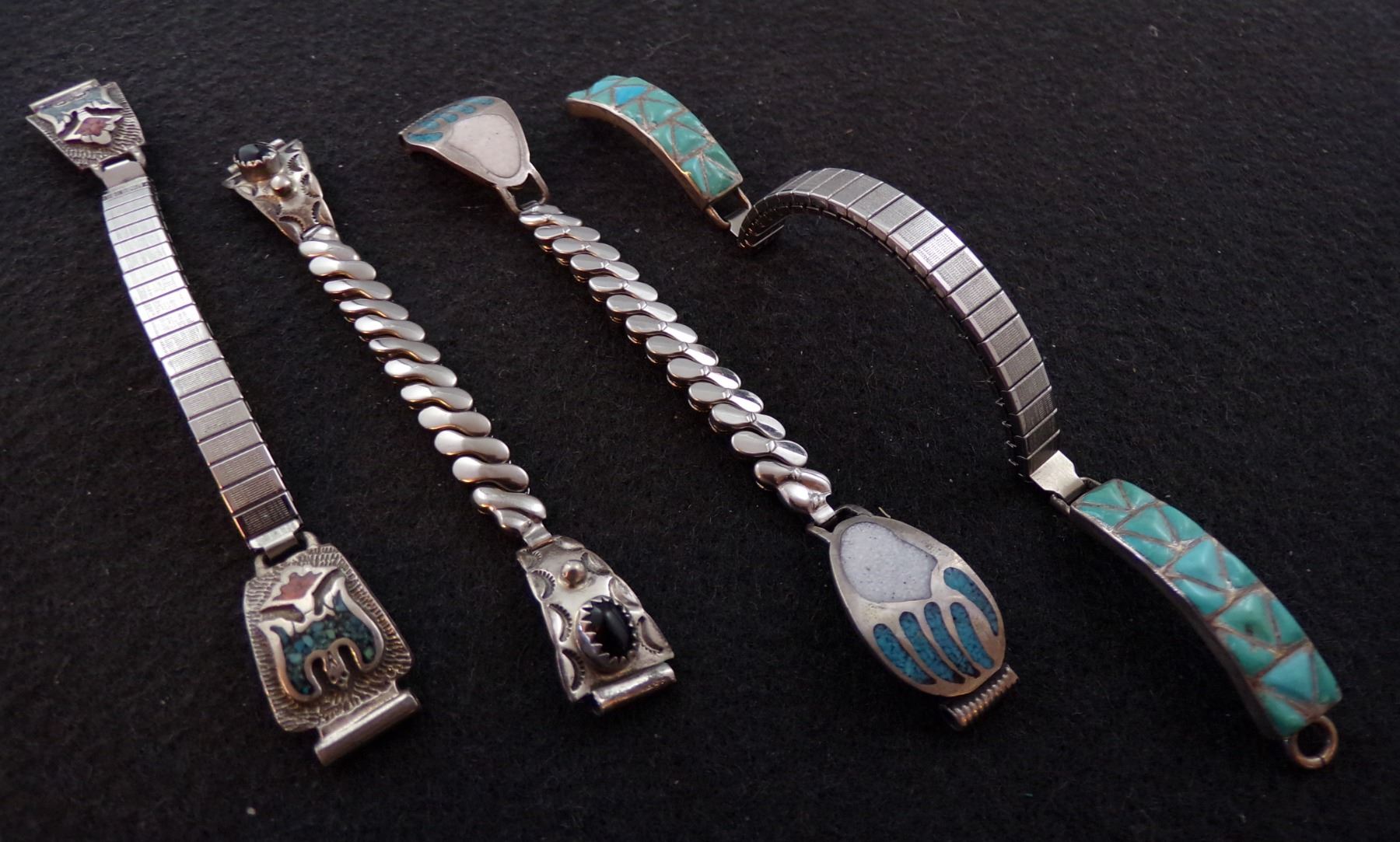 4 Native American Sterling Watch Bands, includes 1. Navajo Sterling Chip Inlay Mother of Pearl and Turquoise Band, hallmarked 2. Navajo Sterling Onyx Band, stamped sterling and hallmarked Thomas 3. Navajo Sterling Chip Inlay Turquoise Coral Band 4. Zuni Inlay Turqoise Band, longest tips measure 1.5'' x .25''