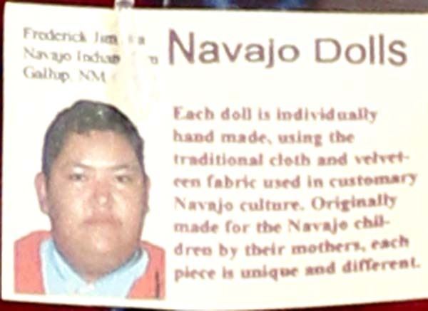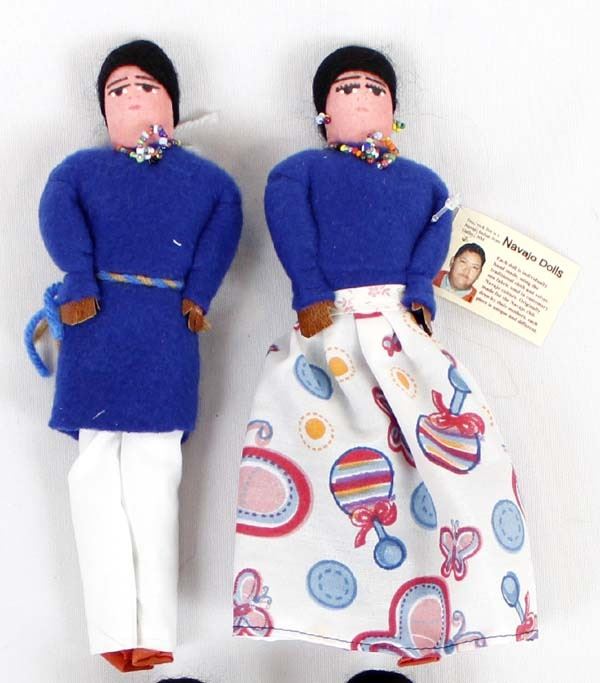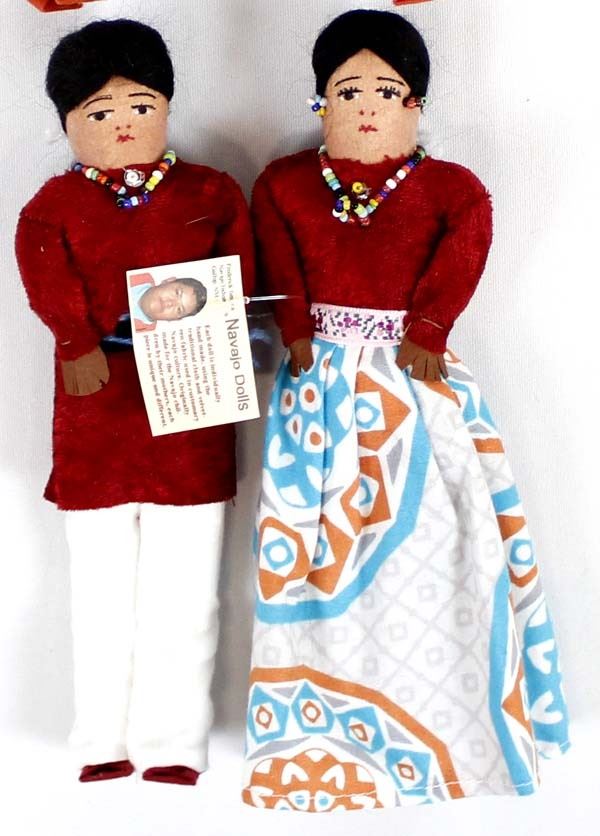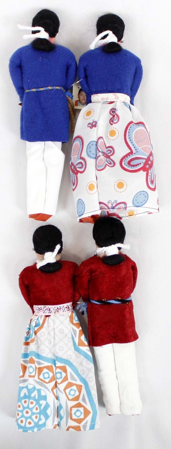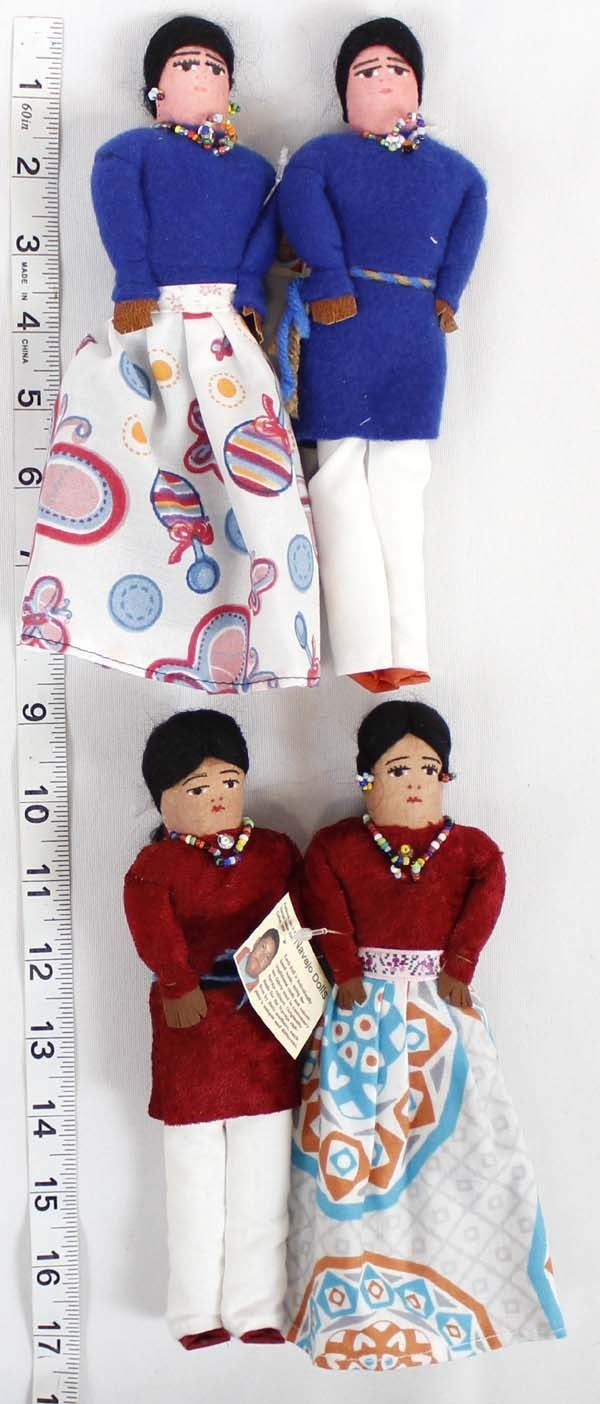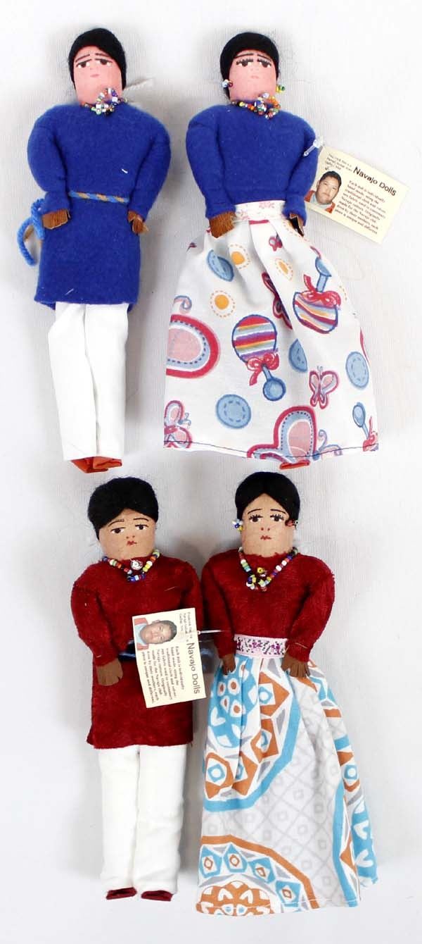 4 Native American Navajo Hand Made Cloth Dolls by Frederick Jim from Gallup, New Mexico. Each doll is individually hand made, using the traditional cloth and velveteen fabric used in customary Navajo culture. Originally made for the Navajo children by their mothers, each piece is unique and different. They measure 8.75"L and are wearing beaded jewelry.