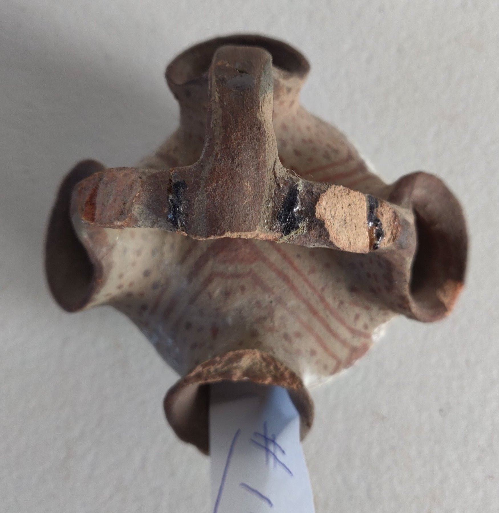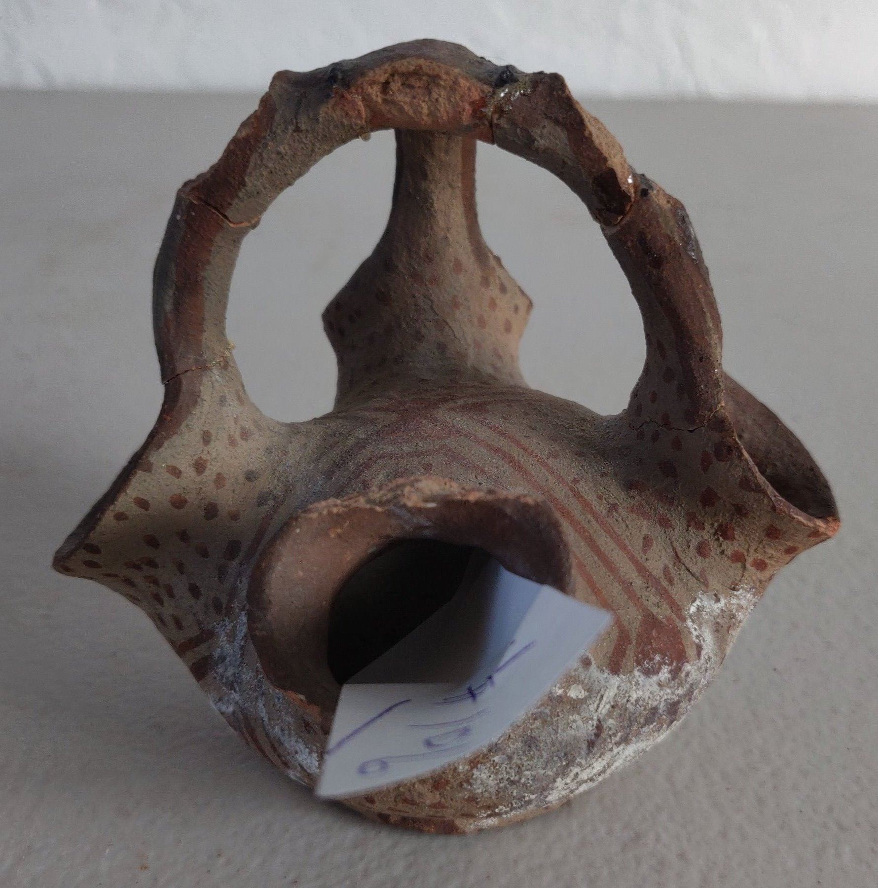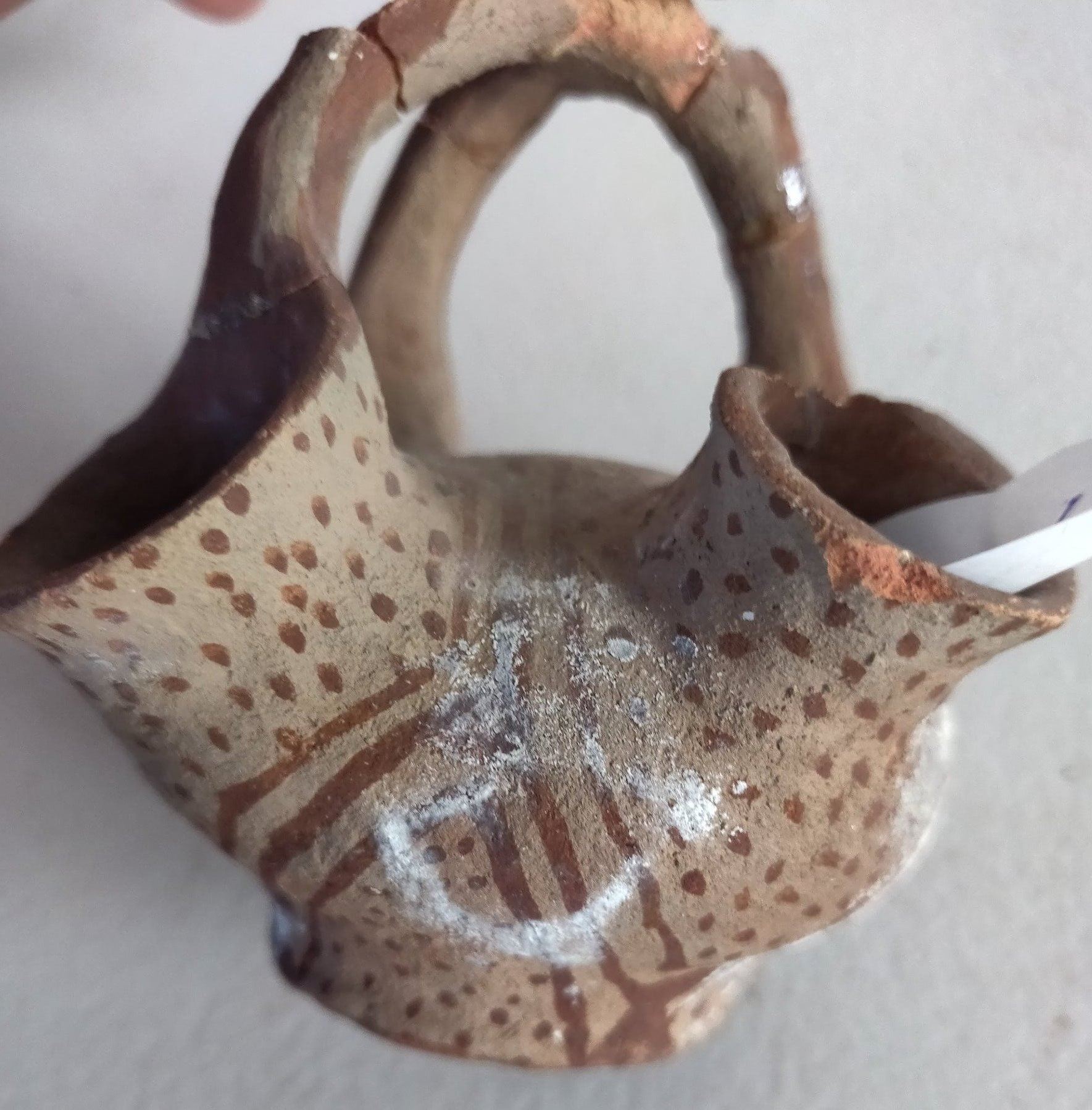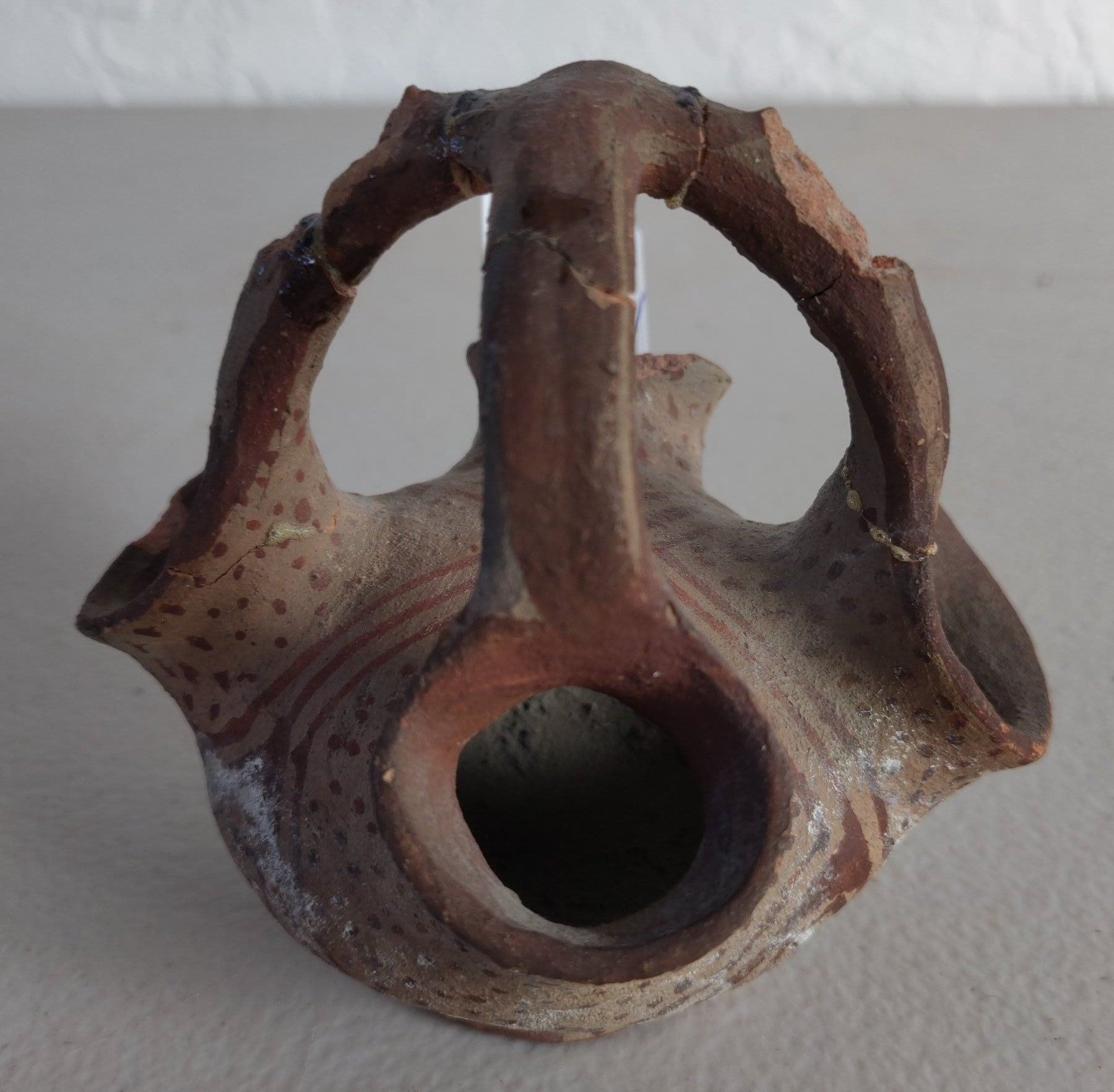 4-Neck Mojave Olla, c. 1920s. Made of clay and paint, the item measures 4" x 3 1/2". Colorado River, USA. Fine painting. Condition: Handle broken and missing, see images. Shipping: $22.50 w/insurance and signature, due to value.