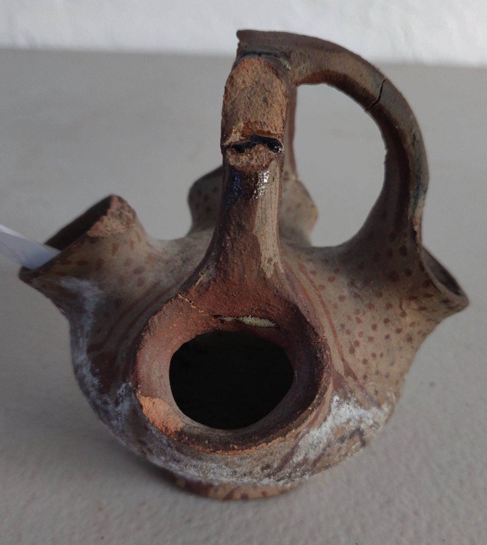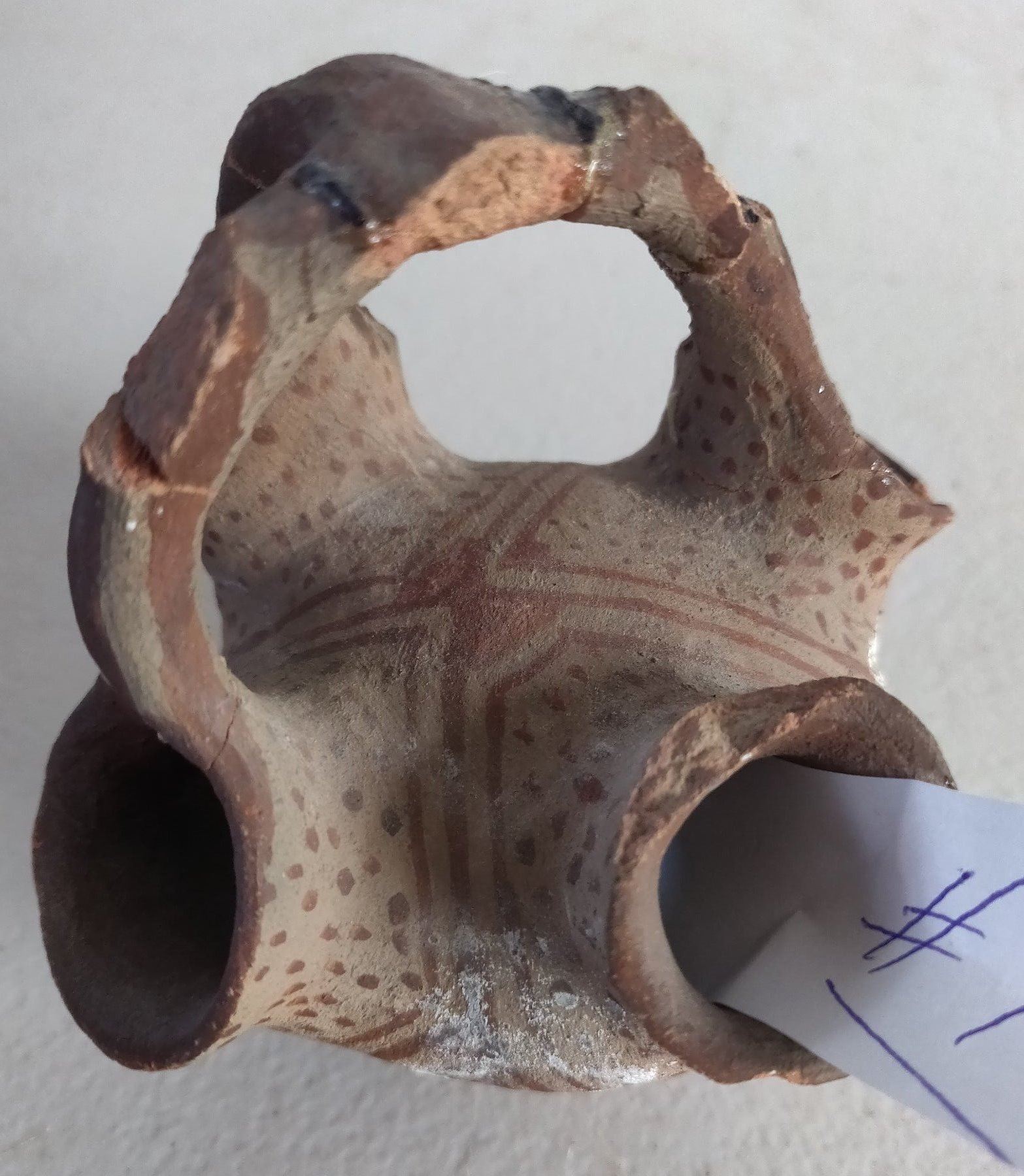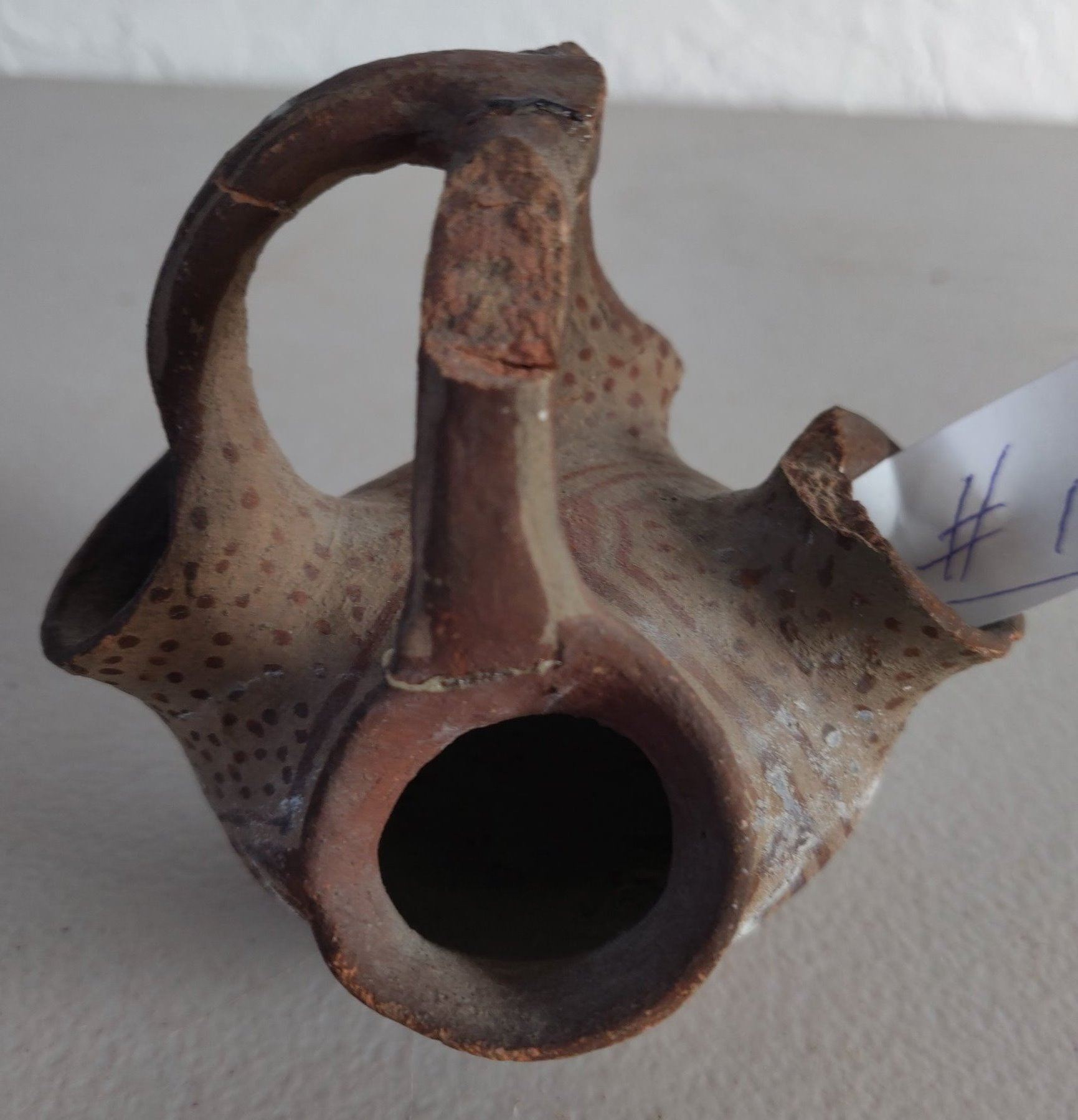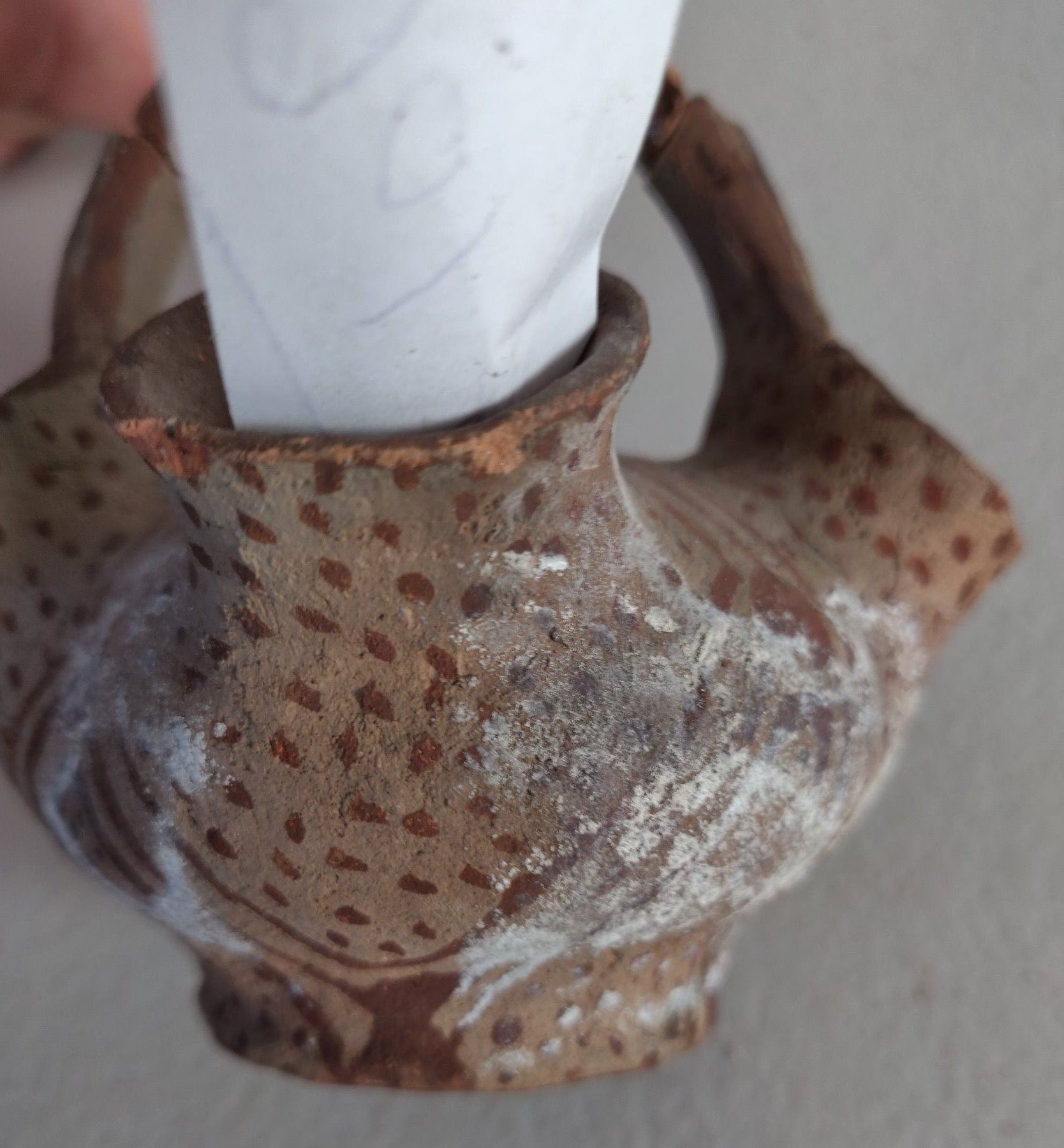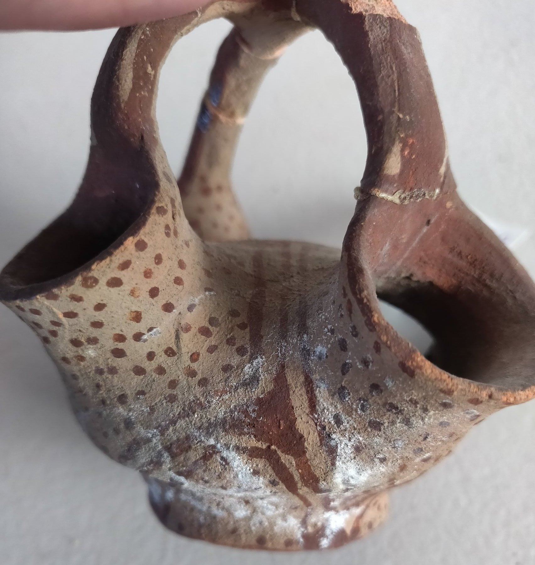 4-Neck Mojave Olla, c. 1920s. Made of clay and paint, the item measures 4" x 3 1/2". Colorado River, USA. Fine painting. Condition: Handle broken and missing, see images. Shipping: $22.50 w/insurance and signature, due to value.