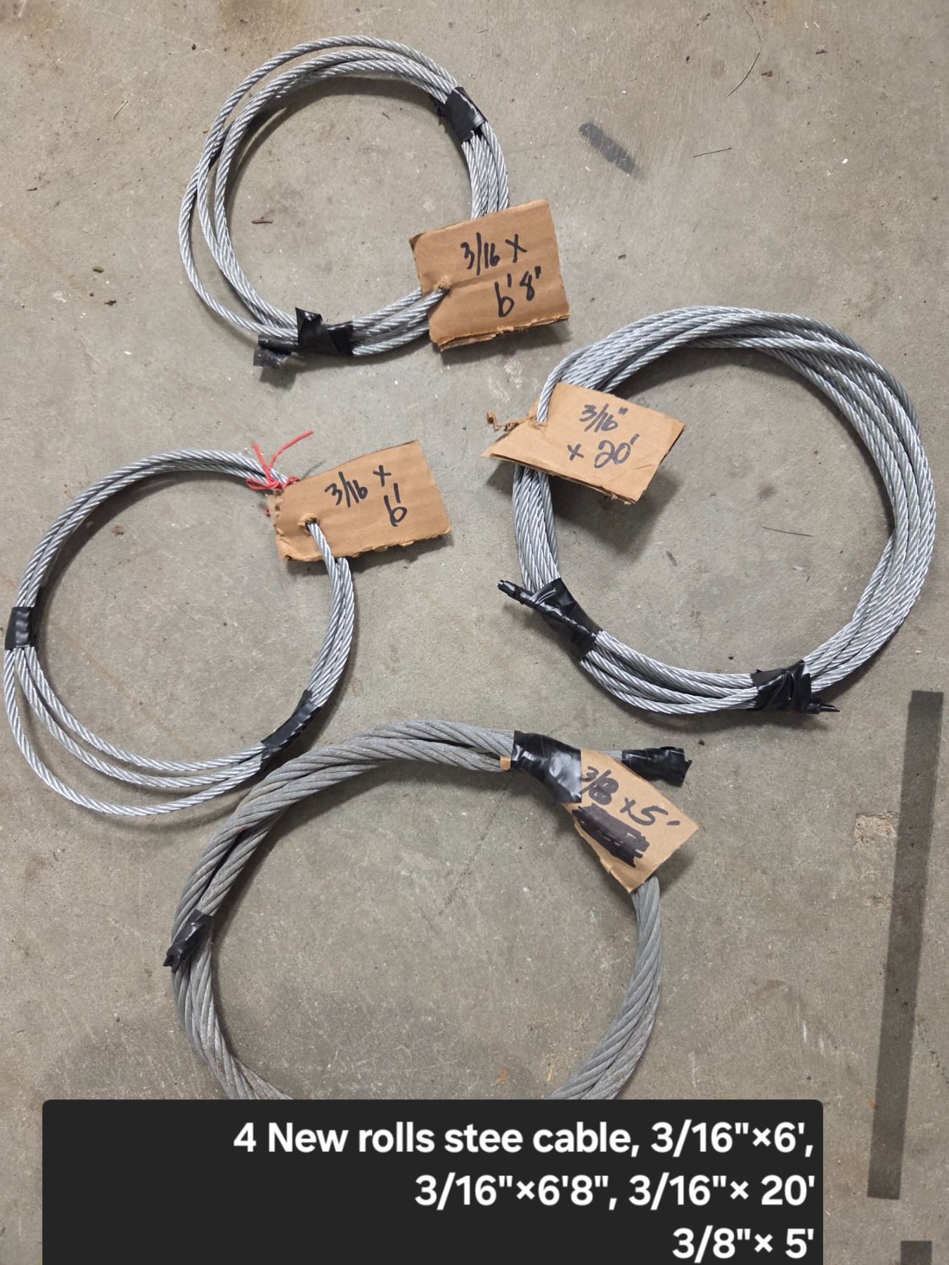 4 New Rolls Steel Cables (3/16"x6) (3/16"x6' 8") (3/16"x20') (3/8"x5')