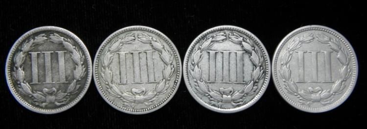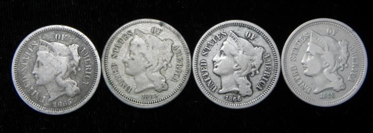 Up for auction are these 4 Nice 1865-1868 3 Cent Nickels. The dates on these nice coins are:1865--1866--1866--1868--