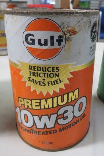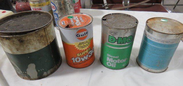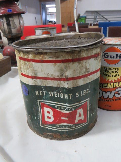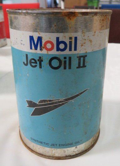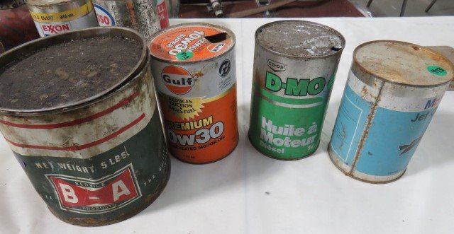 4 OIL TINS - GULF, COOP, MOBIL JET OIL II - PARTLY FULL, BA 5LB OIL
