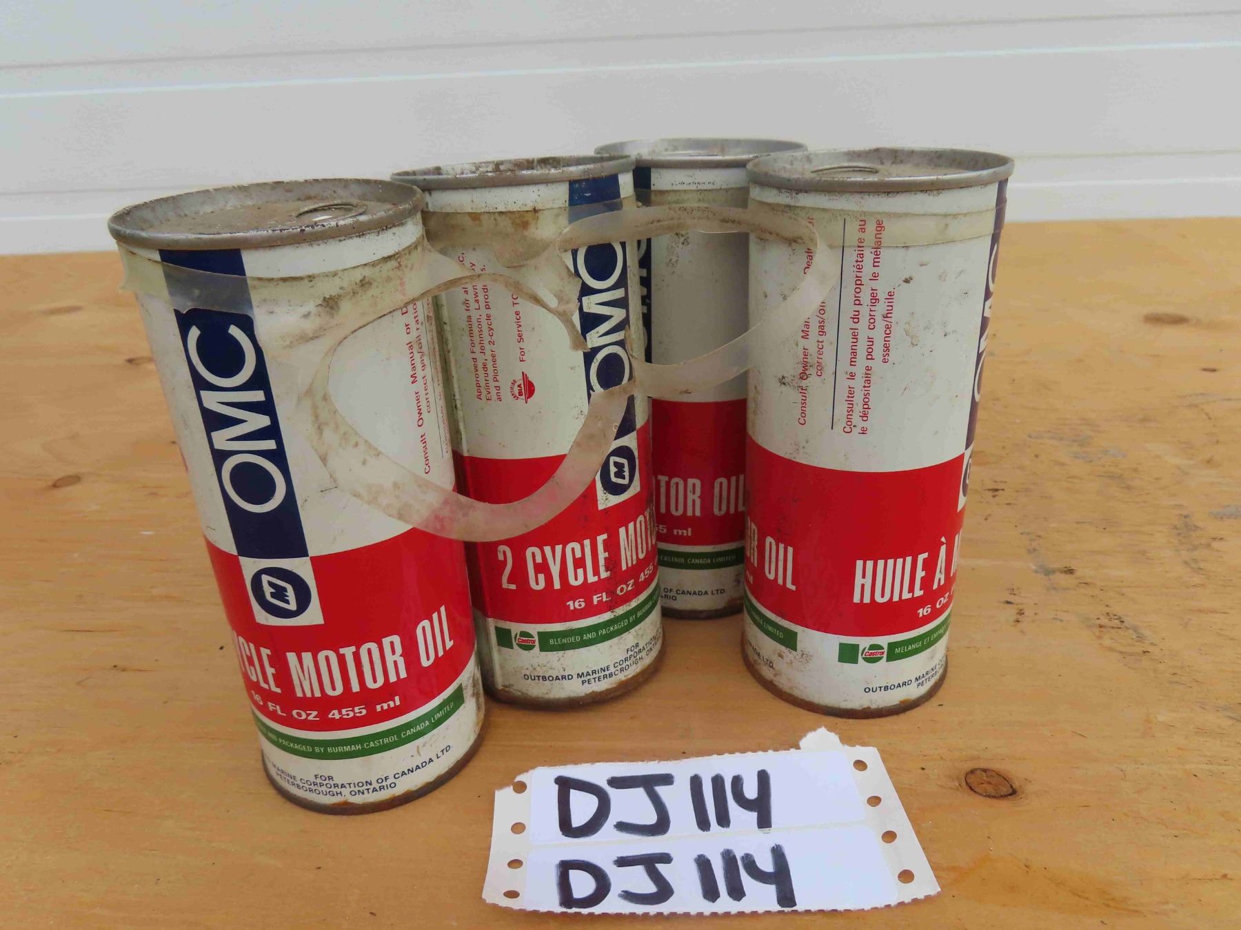 4 OMC 2 Cycle Engine Oil 16 OZ Tins with Original Plastic Holder English and French