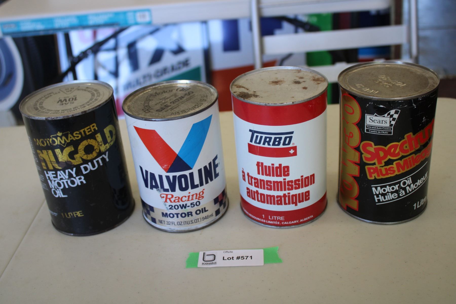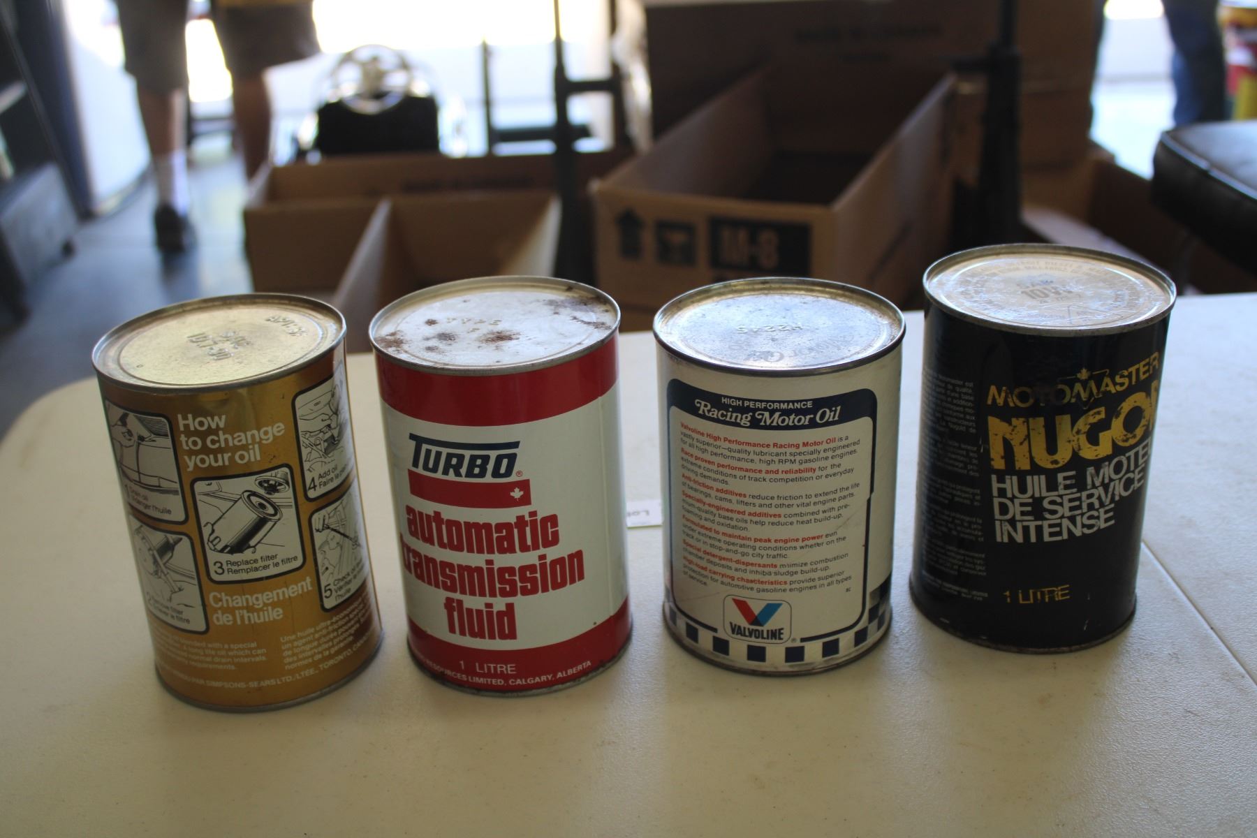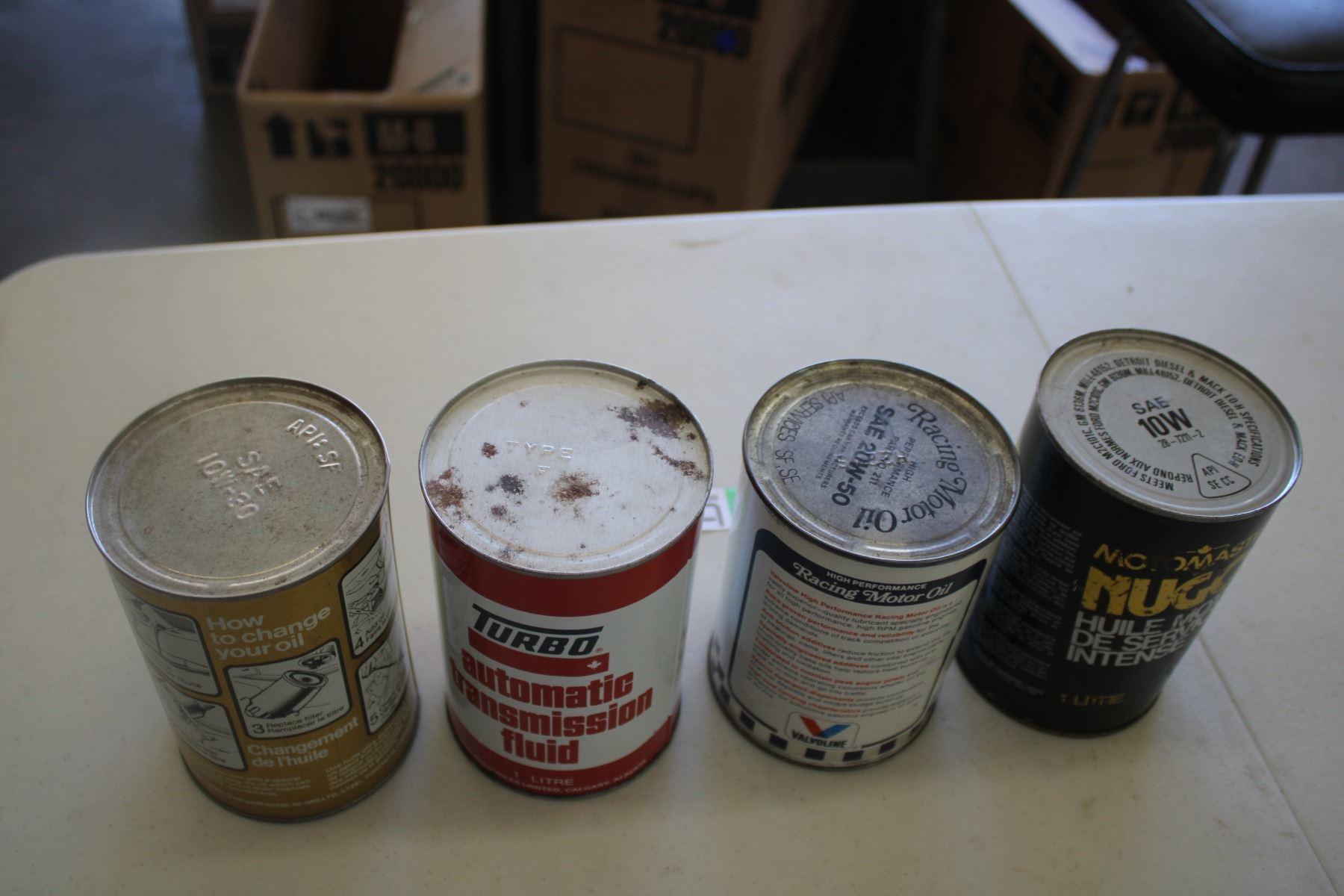 (4) Oil cans - Motomaster Gold, Valvoline Racing, Turbo ATF, Sears 10W30