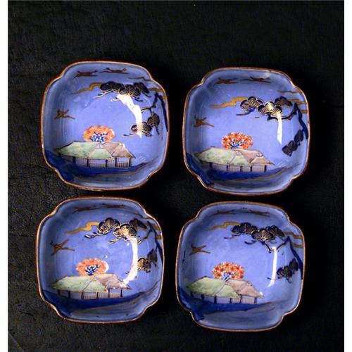 Set of 4 Old (1930's) Japanese Cobalt Blue Imari Farm House Scene Bowls with Chocolate Rims