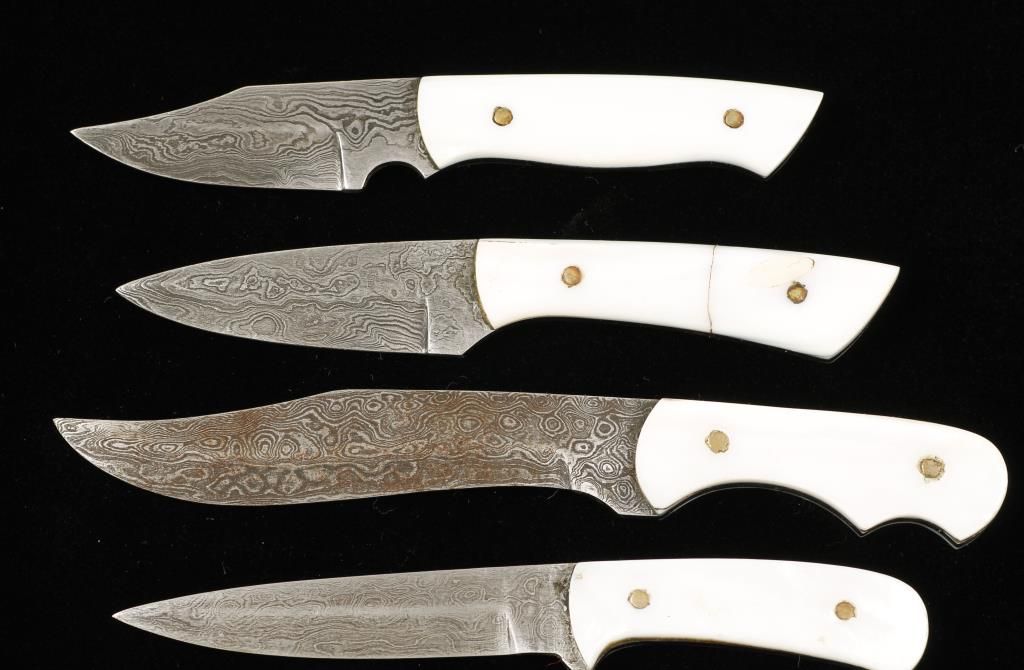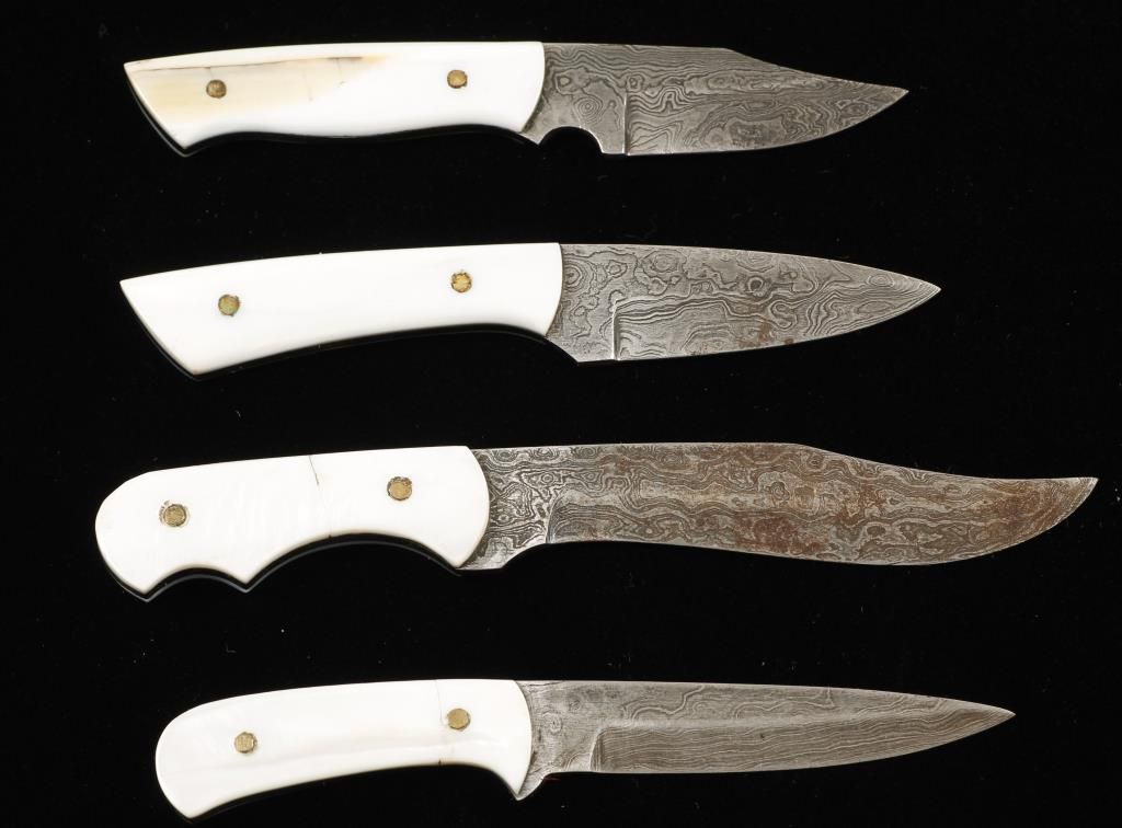 They measure from 4" long to 5" long overall. The blades are all Damascus folded steel. All four have a pair of mother of pearl scales riveted on.