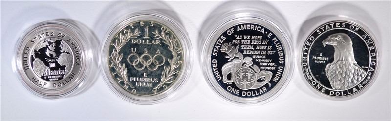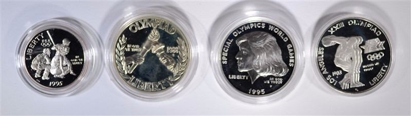 4- Olympic Commemorative Sets - 1988 Proof Silver Dollar, 1995 Clad Baseball Half Dollar, 1984 Olympic Proof Dollar, and 1995 Special Olympics Proof Dollar ESTIMATE $100 - $130.