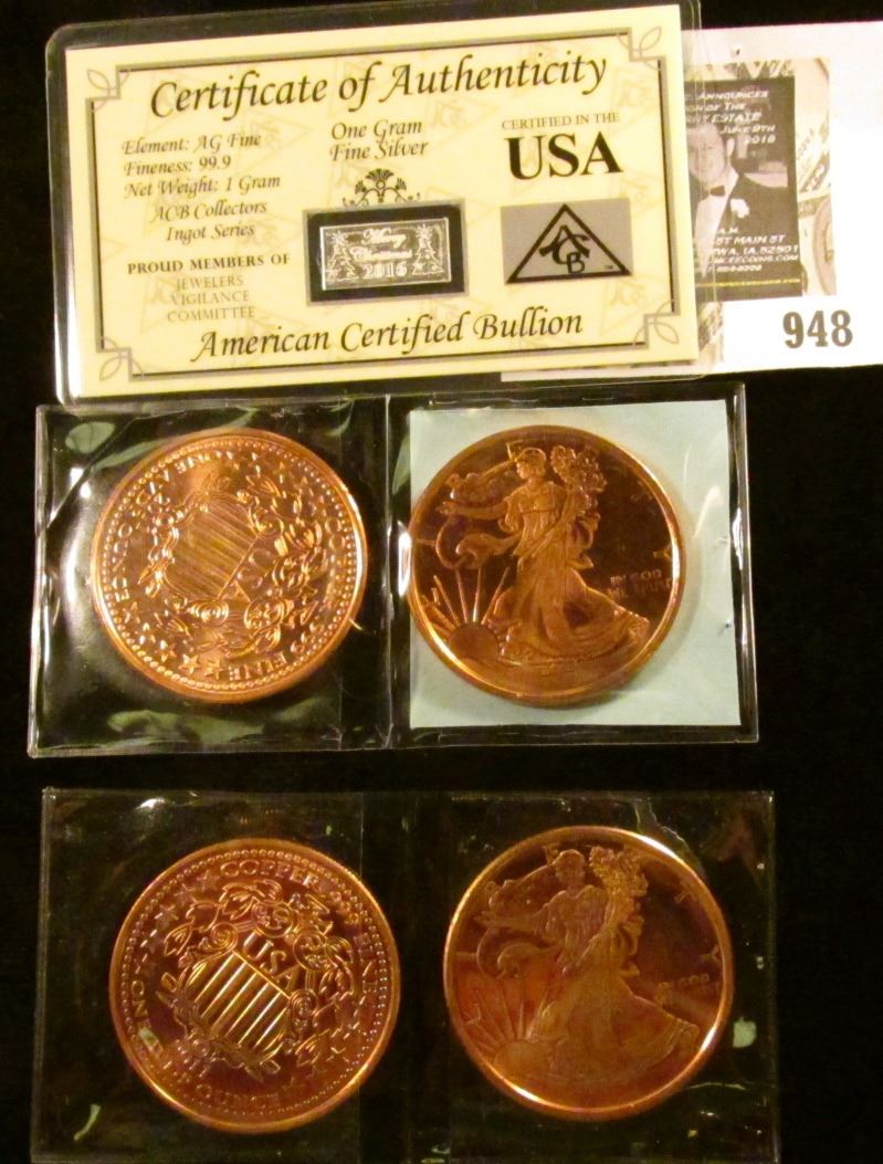 4 One OZ Copper Walking Lib Rounds, One Gram Silver Ingot