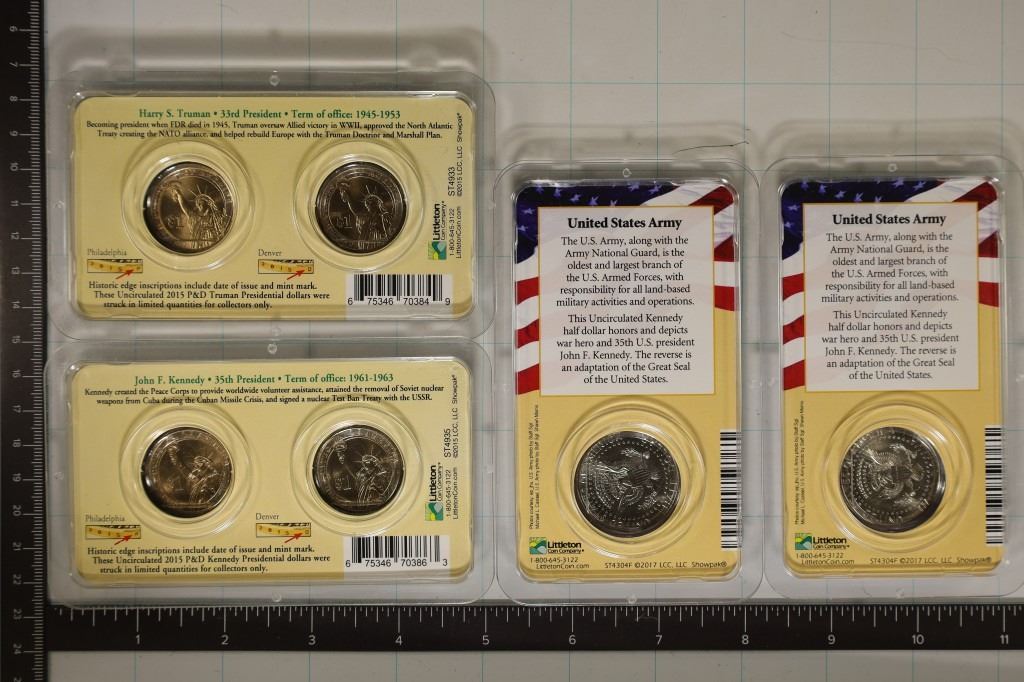 HARRY TRUMAN PRESIDENTIAL DOLLARS, 2015-P & D JOHN F. KENNEDY PRESIDENTIAL DOLLARS, 2017-P KENNEDY HALF DOLLAR AND 2017-D KENNEDY HALF DOLLAR. ALL COINS ARE UNC