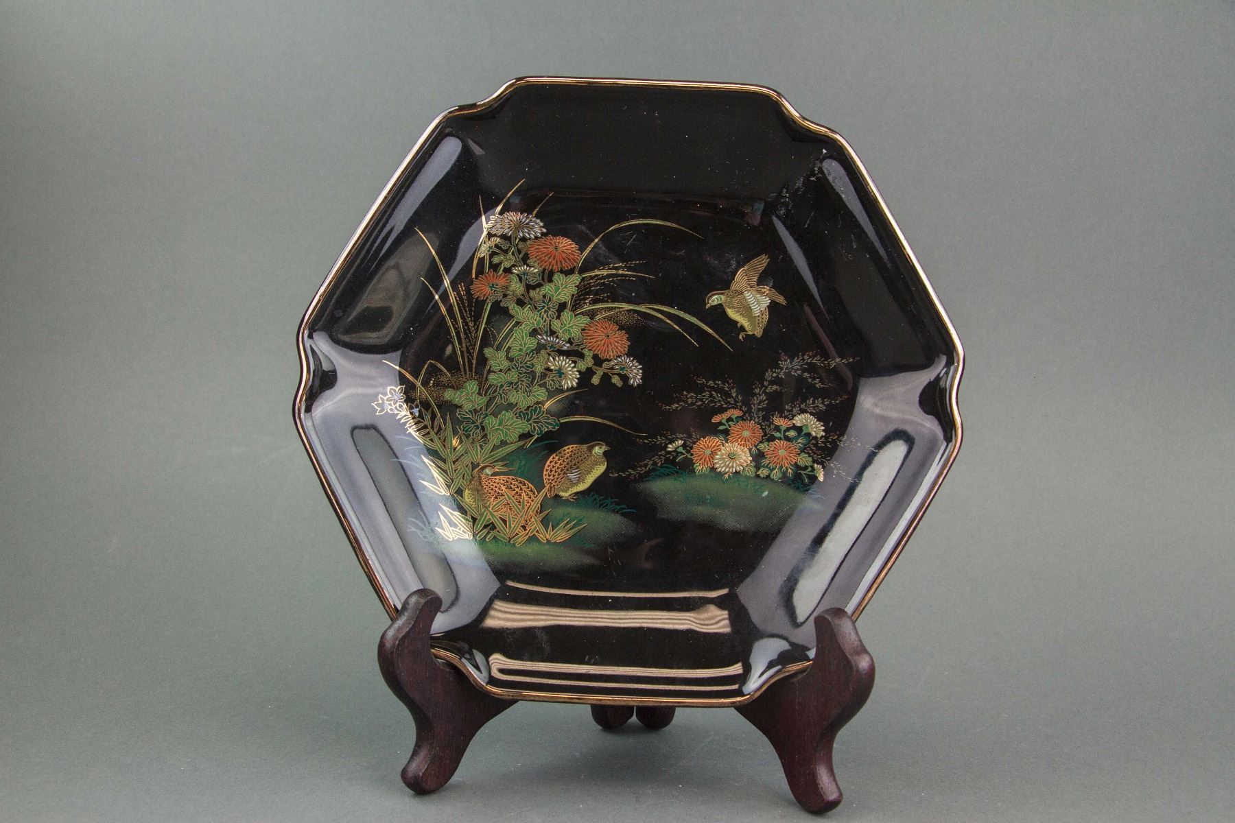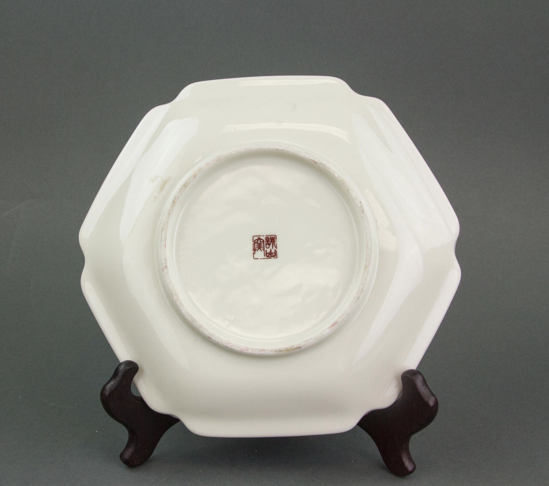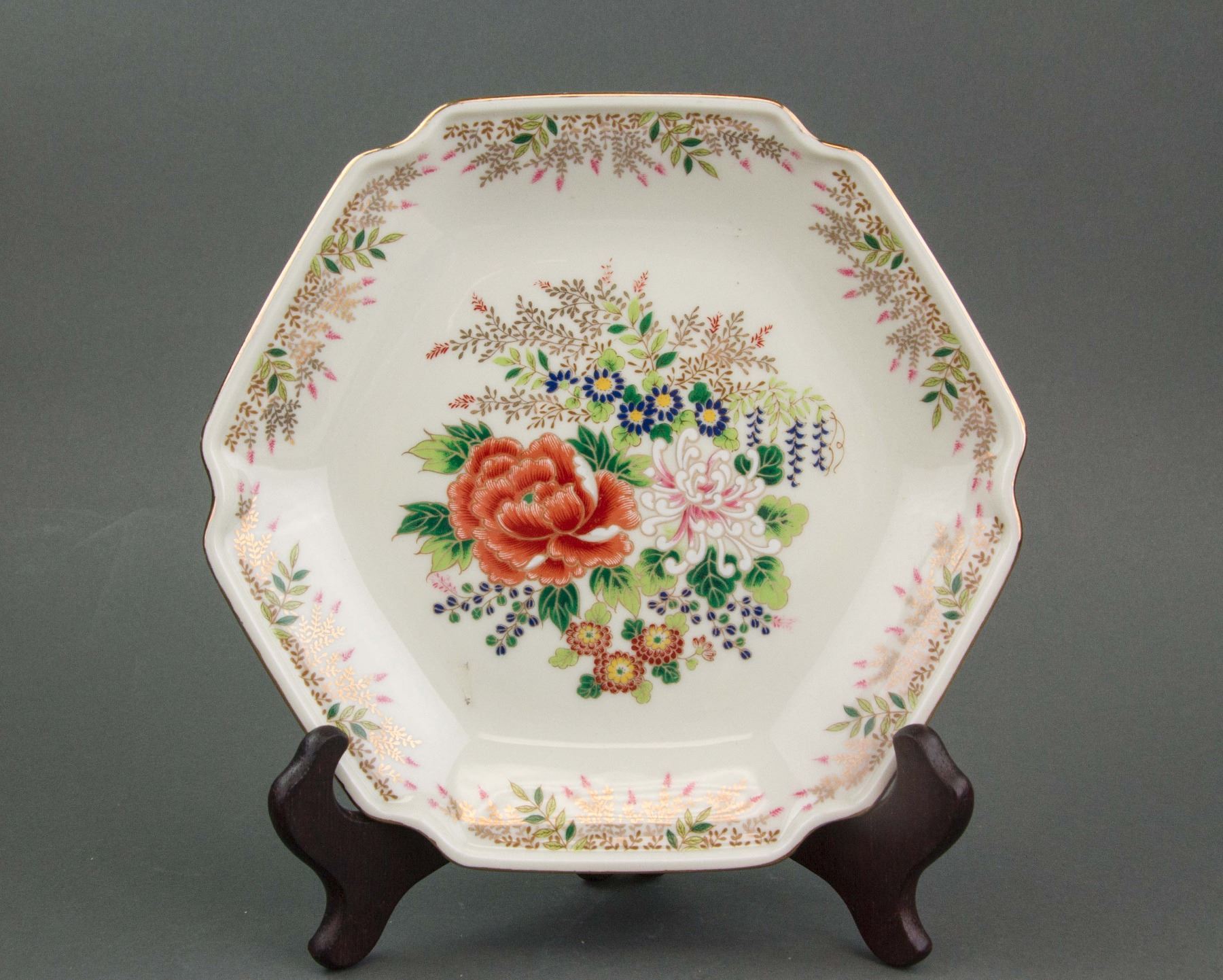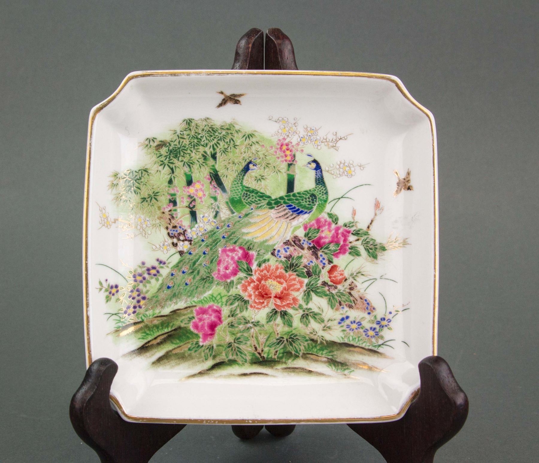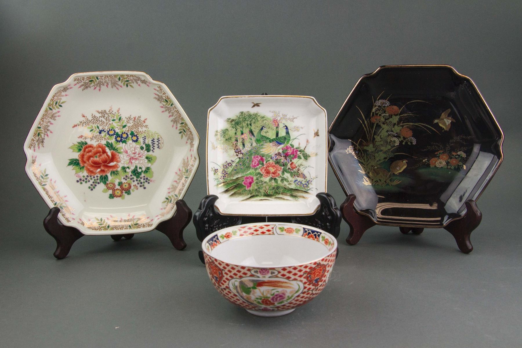 Four pieces of assorted porcelain plates and bowl; of varied size; painted with flowers, birds and peacocks; 3 plates have maker's marks and "JAPAN" marks on base; 2.5 cm - 3 cm x 13.5 cm - 19 cm x 13 cm - 20 cm, 298 grams - 407 grams