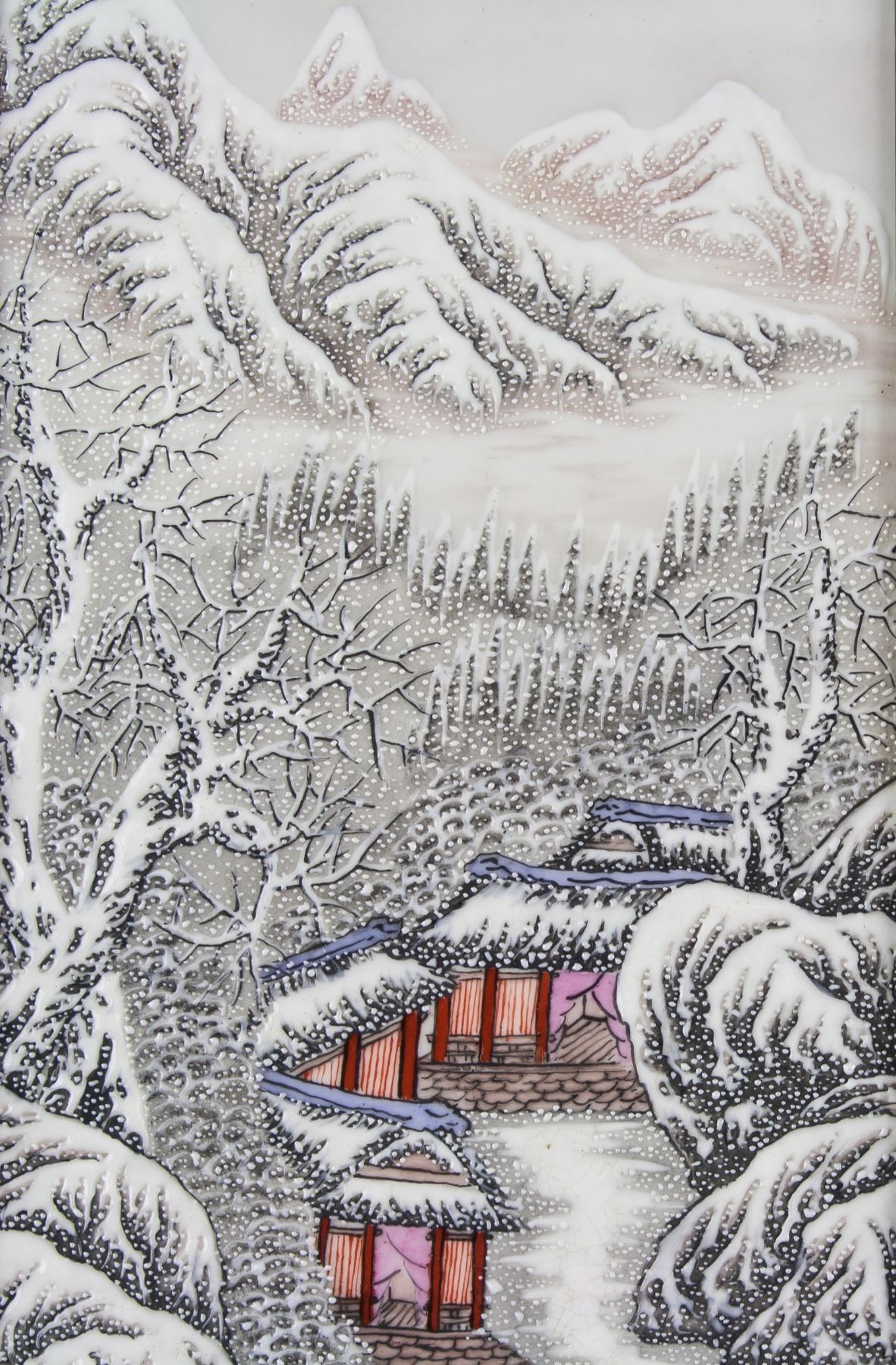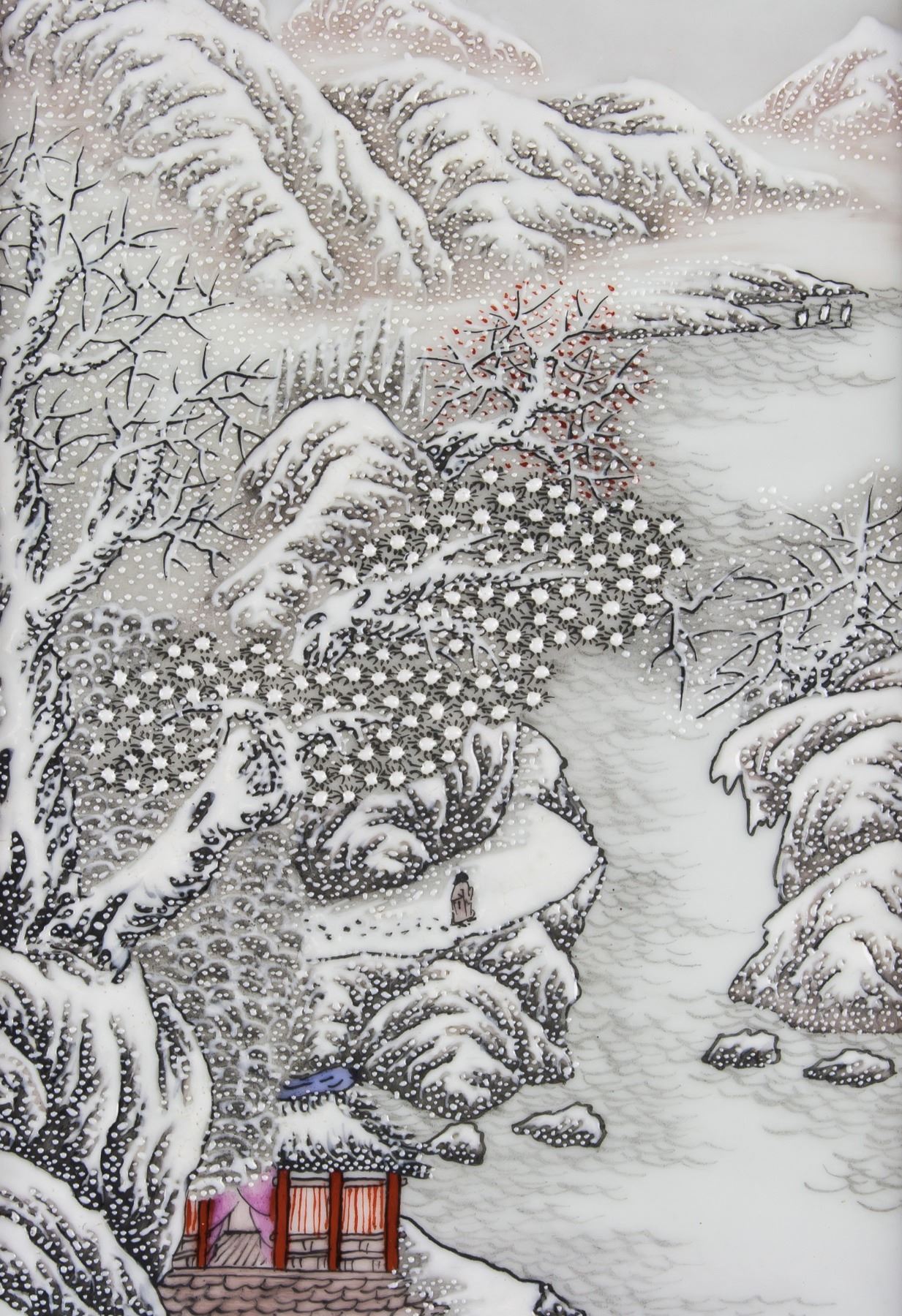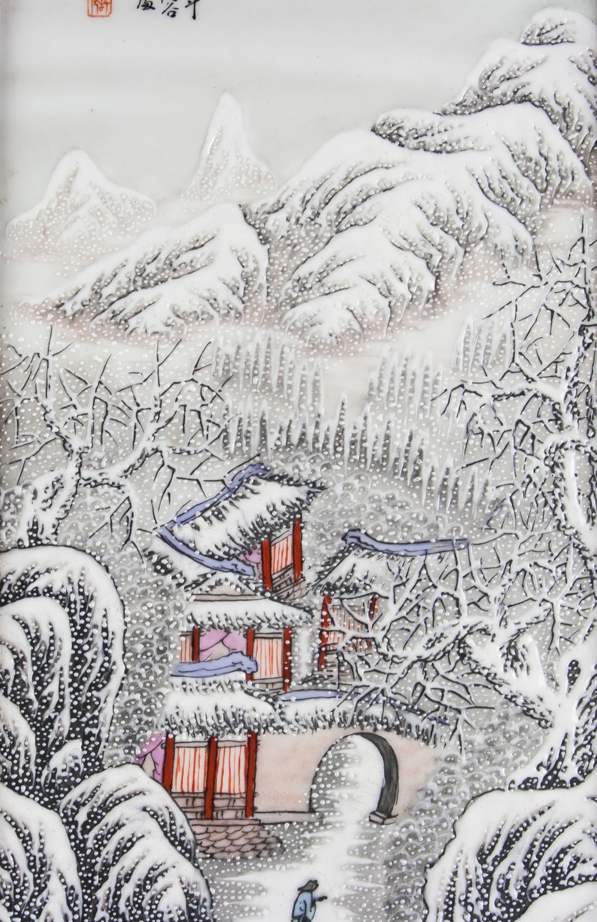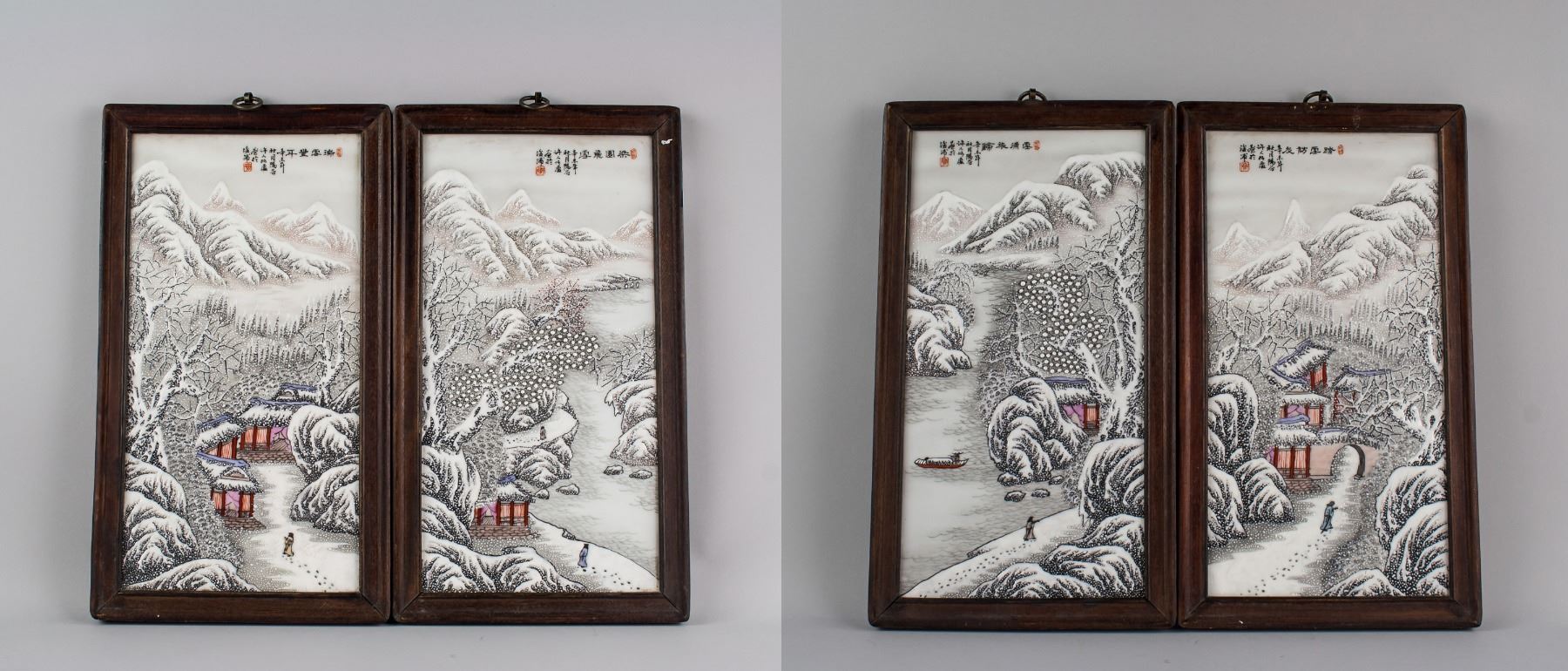 4 pieces of porcelain painting plaque; painted with mountainous landscape with snow scene; signed He Xuren (1882-1940); one of Zhu Shan Ba You, inscribed with 4 artist seals; 23.5 cm x 41.5 cm