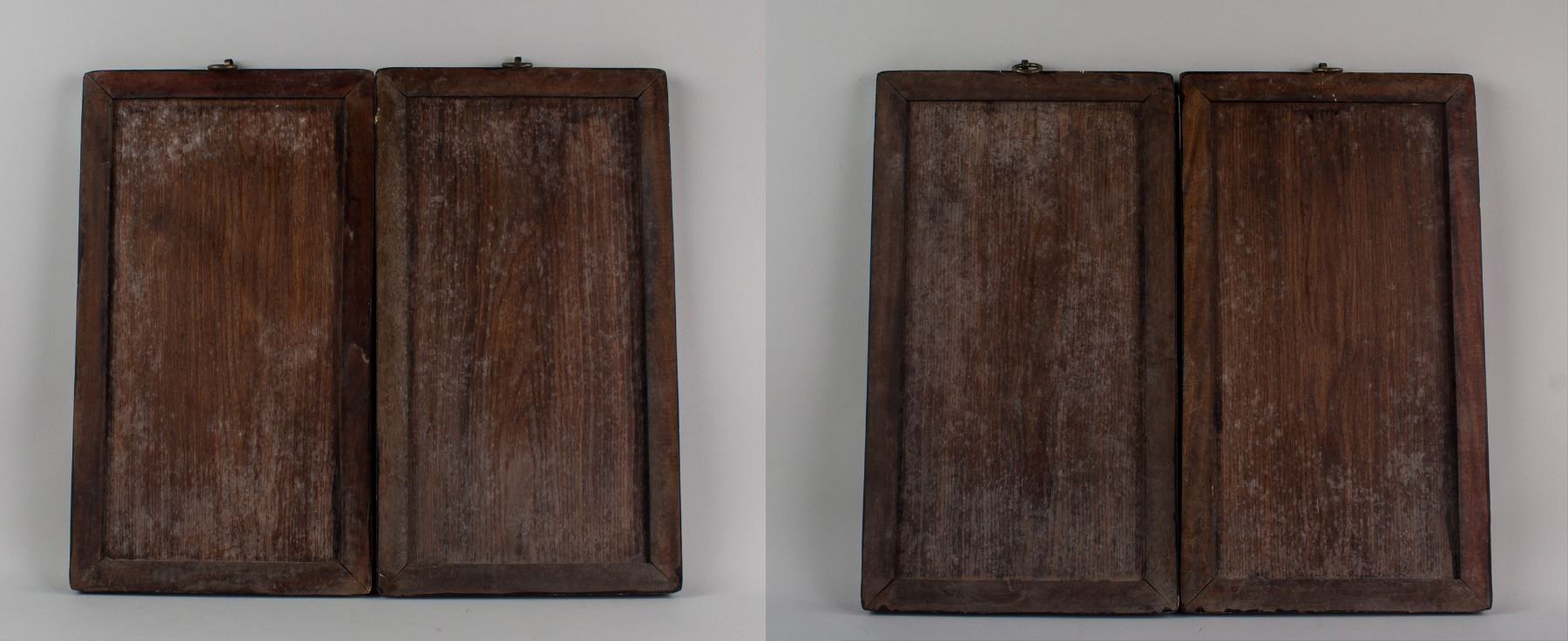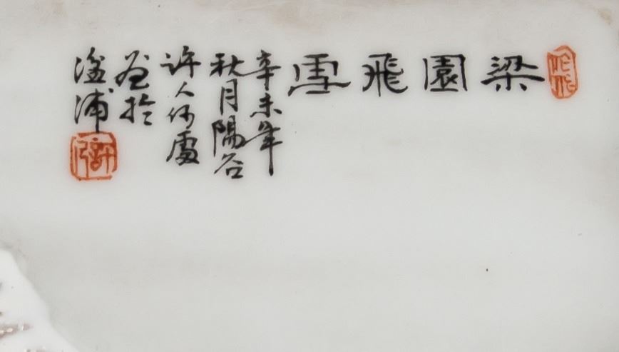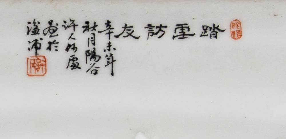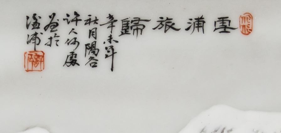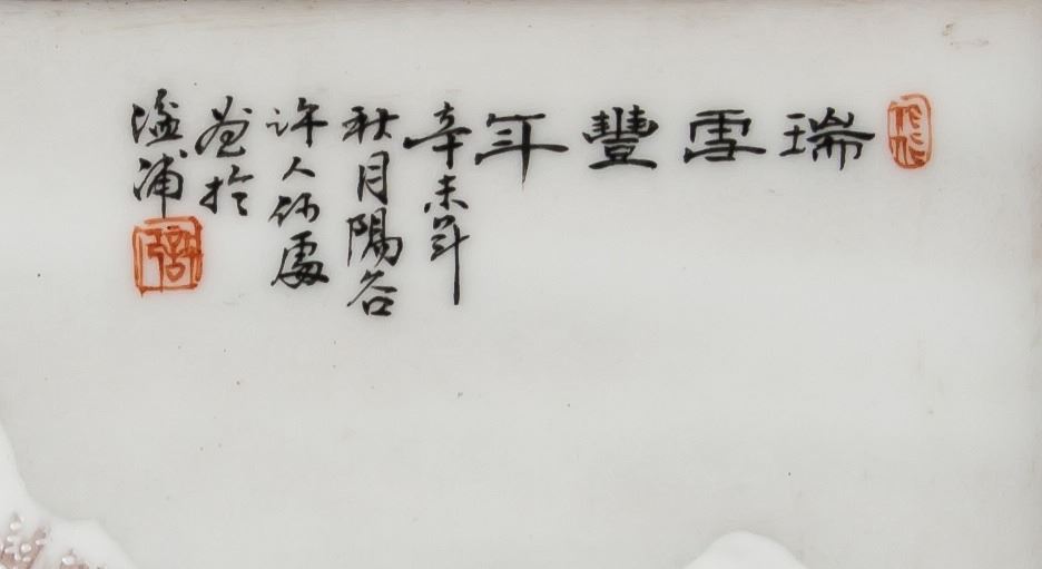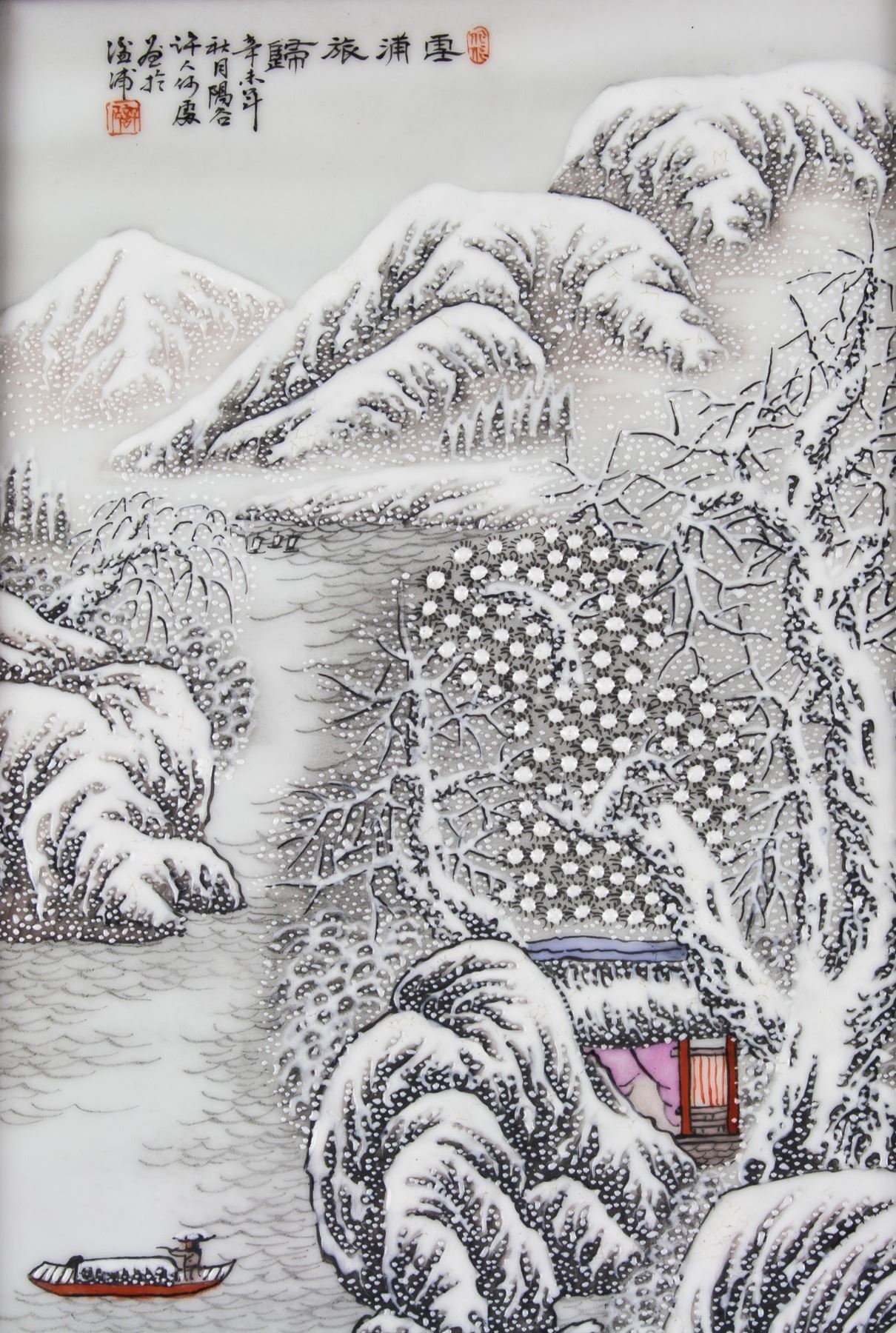 4 pieces of porcelain painting plaque; painted with mountainous landscape with snow scene; signed He Xuren (1882-1940); one of Zhu Shan Ba You, inscribed with 4 artist seals; 23.5 cm x 41.5 cm