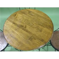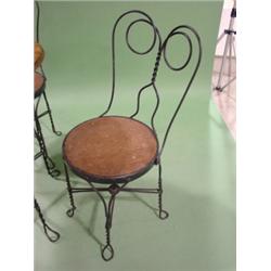 4 PIECE ICE CREAM PARLOR SET. Consists of table and three chairs. Table is marked on bottom base "Pierce Ind.-Walden N.Y." Table: 30" H, 24" Dia. Chairs: 35" H to top of back, 14.5" W