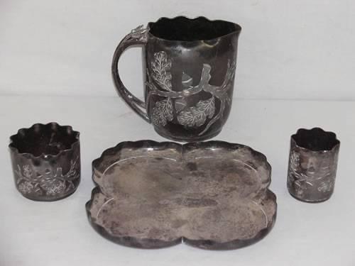 4 PC. SILVER PLATED FIRE PRESENTATION WATER SET BY AURORA SILVERPLATE CO. W/ BRIGHT CUT DECORATION - PRESENTED " COMPLIMENTS OF RESCUE HOOK and LADDER CO. TO JOHN W. LUEPPEL APR. 3RD 1898 - WEAR and SILVER PLATING LOSS;