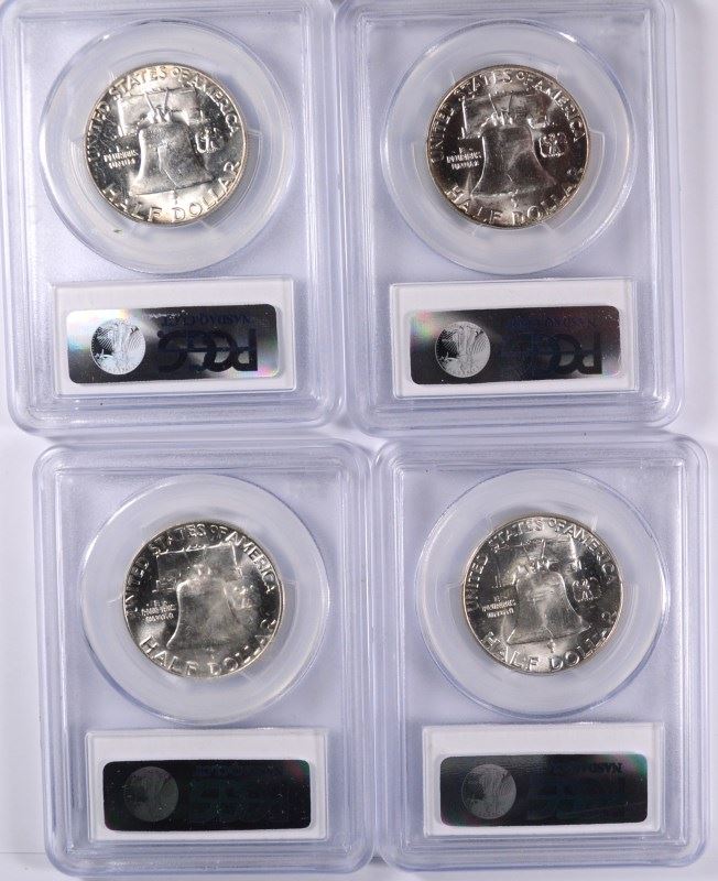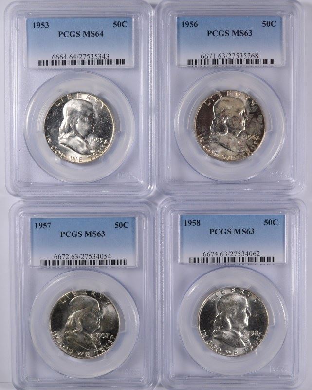4 - PCGS FRANKLIN HALF DOLLARS; 1953 MS64 & 1956, '57, '58 MS63