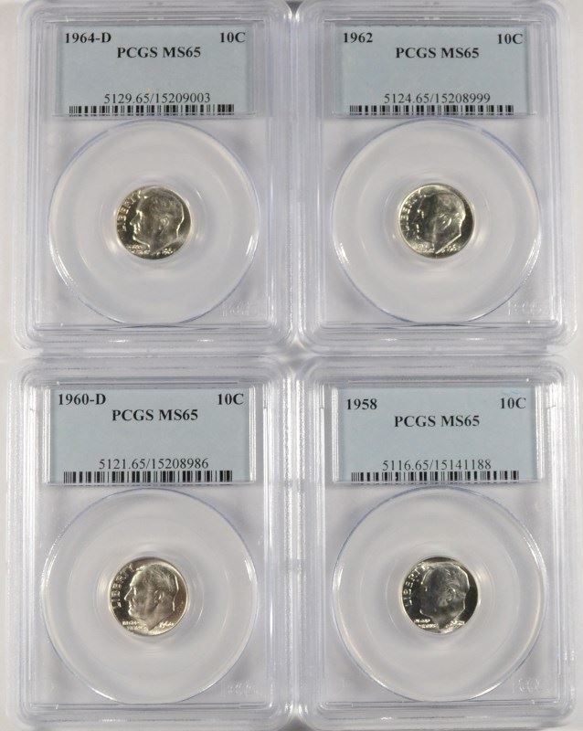 ( 4 ) PCGS GRADED MS-65 ROOSEVELT DIMES: 1958, 60-D, 62 & 64-D