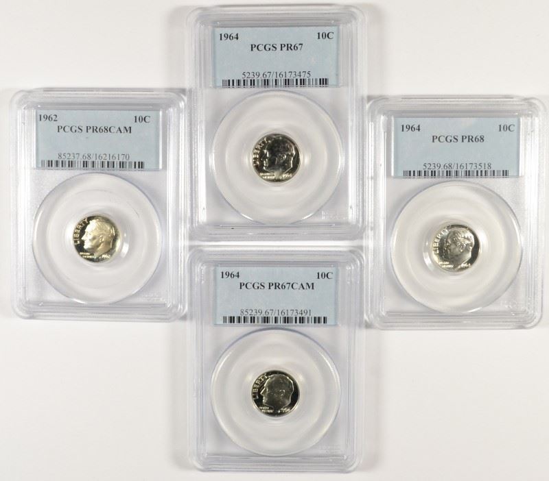 4-PCGS GRADED ROOSEVELT DIMES: 1962 PR-68 CAM, 64 PR-67, 64 PR-67 CAM & 64 PR-68