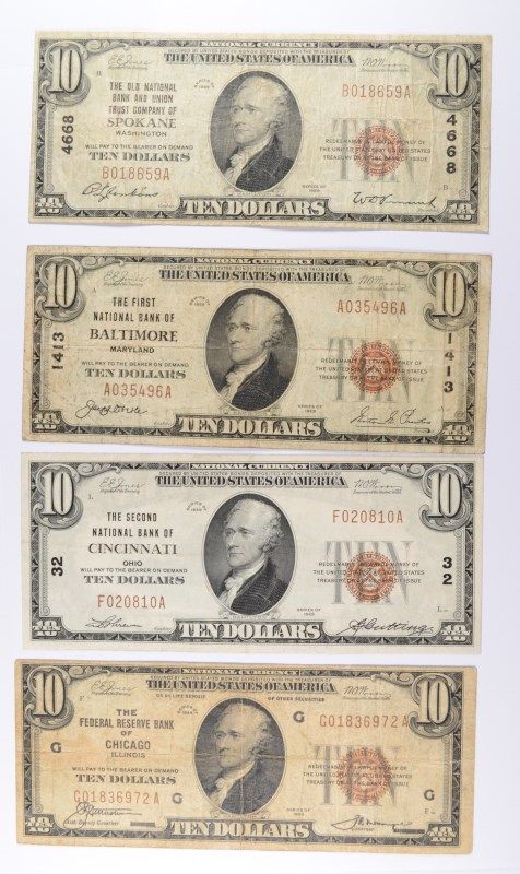 4 PCS 1929 $10.00 NATIONALS: ALL VG+ ONB SPOKANE, WASH; FNB BALTIMORE, MD,