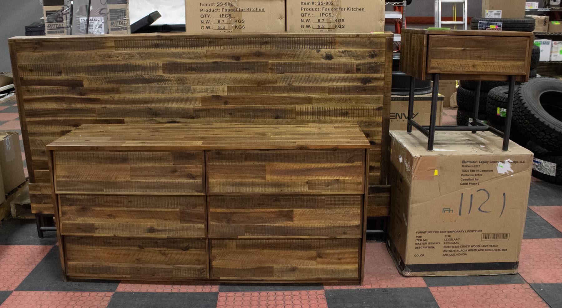 INCLUDES HEADBOARD FOOTBOARD DRESSOR AND 2 NIGHTS STANDS. FREIGHT CLAIM ALL AUCTION ITEMS ARE SOLD AS IS 33004