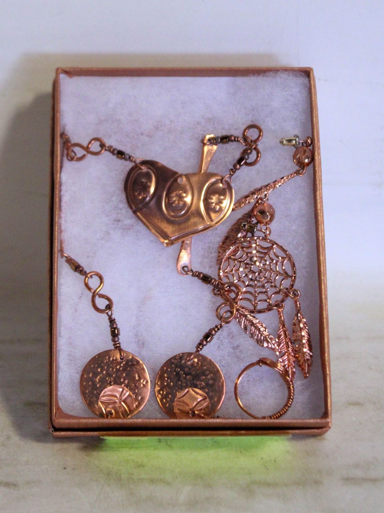 1) 72 CM LONG COPPER BOHO NECKLACE 2) COPPER SPIDER WEB PENDANT WITH 3 FEATHERS 3) WIRE WRAPPED, SPIRAL, COPPER RING, SIZE 8, ALL IN A BOX.